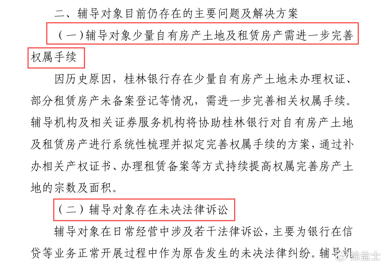 报告披露,桂林银行在2025年1-3月辅导期内存在的两大主要问题:一是因历史原因,桂林银行存在少量自有房产土地未办理权证、部分租赁房产未备案登记等情况,需进一步完善相关权属手续;二是桂林银行作为原告涉及若干未决的法律诉讼。