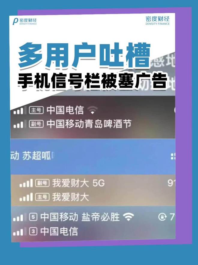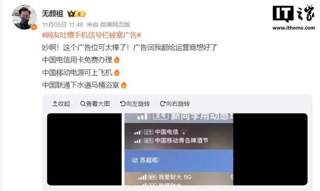 IT之家11月6日消息,有网友近日在社交媒体发帖称,手机信号栏处的卡号运营商名称发生变化,多出了类似广告的文字。不少网友表示也遇到过该情况,还一度以为是手机出了问题。