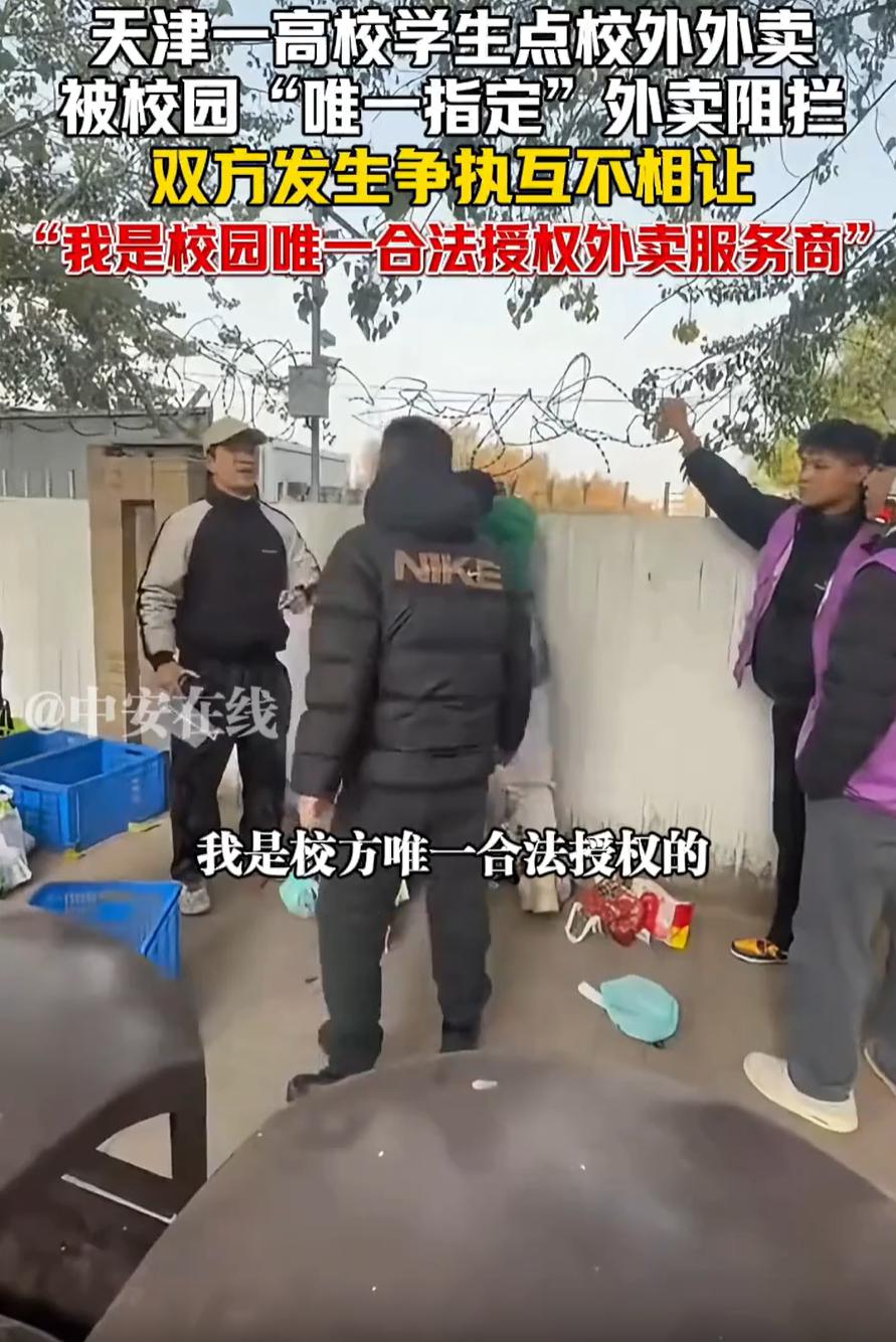 天津,一高校学生点外卖吃,可是中午送餐时,骑手要把餐品隔墙送过去却遭到别人的阻拦,对方自称是学校“唯一指定”外卖,坚决不允许其他外卖配送,还打电话举报,有人往学校里“投毒”,网友:外卖都有垄断? 视频中,学生站在校园一侧准备取餐,但校园外的一侧却相当热闹,骑手想要通过铁丝网的空隙把外卖送进去,结果好几个人在旁边阻拦,甚至还把外卖打翻到地上 其中一名男子表示:我是校方唯一合法授权的配送服务商,我怀疑你投毒,说罢,就拿起电话进行举报,声称骑手把工业大学的铁栅栏给剪掉,质疑他威胁了校园的食品安全 对此,不少网友也是不理解:都已经大学生了,还不允许校外点外卖?现在还出来个唯一指定外卖,这也太奇葩了 其实所谓“唯一指定”,说白了就是一家公司拿下了校内配送权,别的外卖骑手不能进,不管你点的是哪家平台的餐,最后都得通过他们转一手。这种模式学校可能觉得安全、方便管理,但学生体验就没那么好了——餐贵、速度慢、选择少 支持者认为,统一管理可以保障食品安全,维护校园秩序。但反对者则表示,这种做法限制了学生的选择权,形成了事实上的垄断 我觉得,如果真担心食品安全,可以加强检验机制、设置专门取餐区,而不是让学生在铁丝网前隔空接力。毕竟现在外卖系统都有实名登记和送餐追踪,只要管理得当,安全问题完全能解决