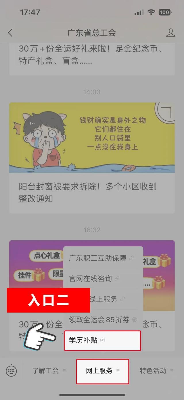 也可以通过「粤工惠」小程序的「服务页」或者「广东省总工会」官方微信公众号菜单栏进入「学历补贴」申请页面。