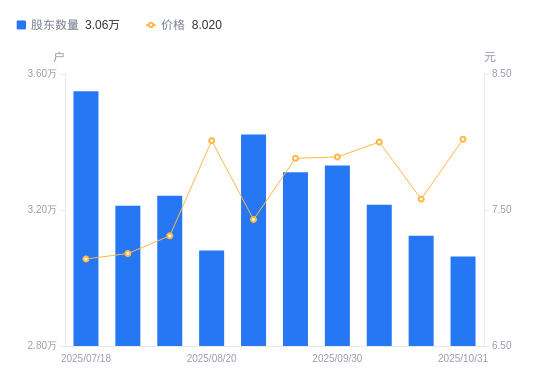日期A股户数(户)流通A股户均持股数(股)户均持股市值(万元)2025-10-313063110557.638.472025-10-203124110351.497.852025-10-103215210058.198.052025-09-30333129707.947.662025-09-10331079768.057.702025-08-29342229449.797.022025-08-203080910496.638.412025-08-08324209975.047.292025-07-313212810065.707.232025-07-18354949111.146.51