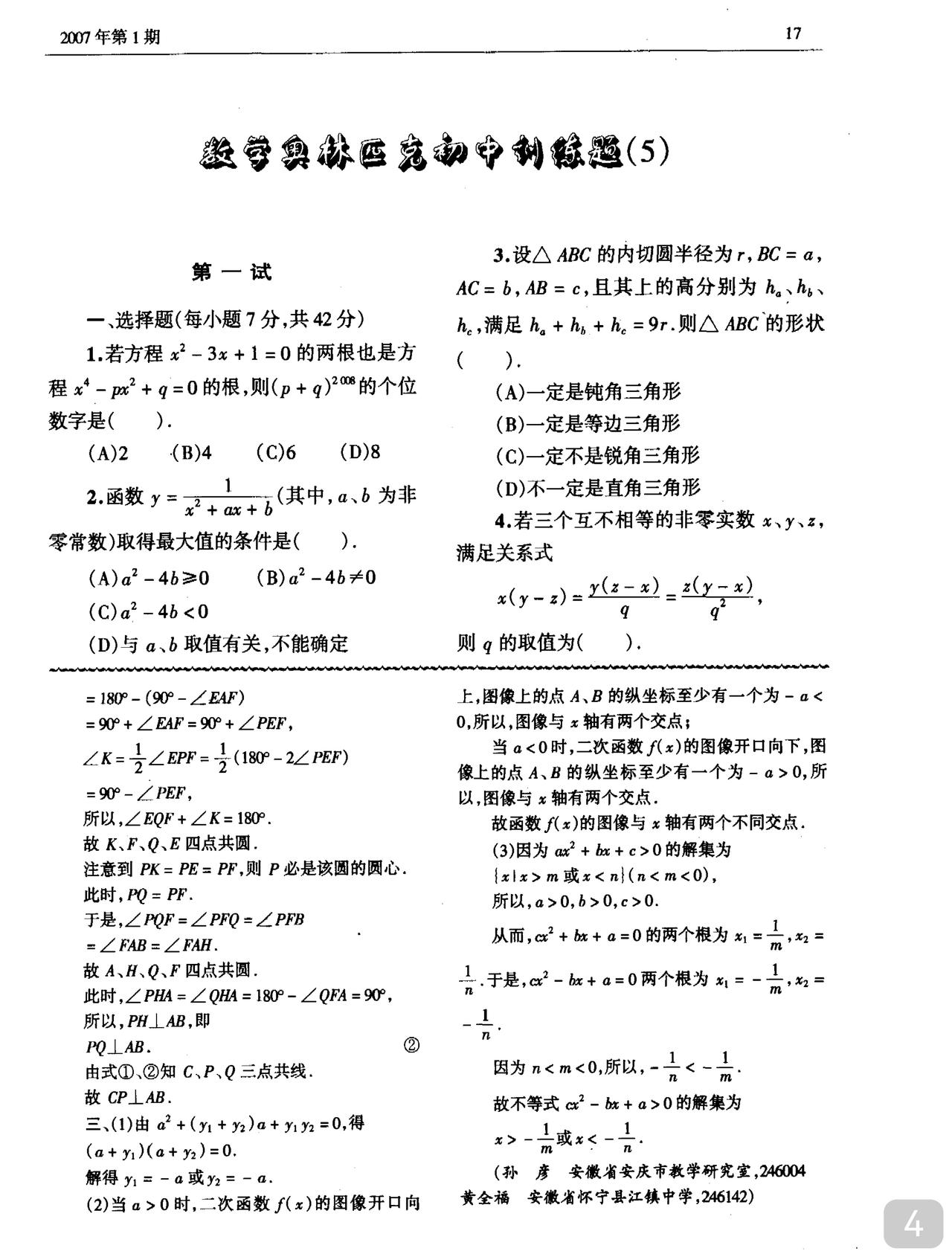 初中数学竞赛模拟卷(4) 含答案 数竞生或强基生可按需练习 抛砖引玉 奥数教程 蓝皮书 第8版 小学初高中 能力测试+学习手册 奥赛强化
