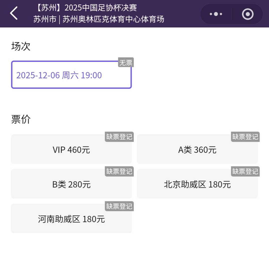 12月6日晚7点,2025赛季足协杯决赛将在苏州奥体中心体育场打响。尽管距离比赛还有整整一个月,门票预售已早早启动。11月6日上午10点58分,大麦网、票星球等互联网平台同步开启售票。仅仅一分钟,所有门票便被抢购一空,抢票难度堪比苏超决赛。
