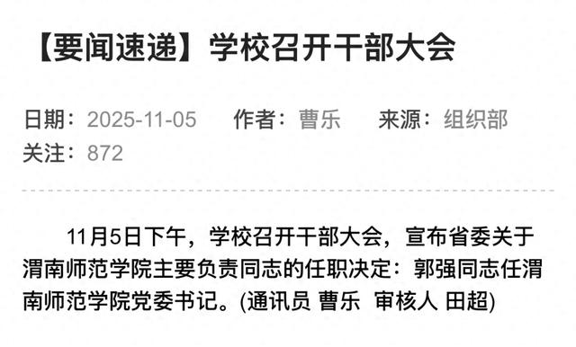 据渭南师范学院消息,11月5日下午,学校召开干部大会,宣布省委关于渭南师范学院主要负责同志的任职决定:郭强同志任渭南师范学院党委书记。