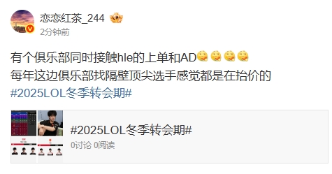 直播吧11月6日讯LPL爆料人“恋恋红茶”更博爆料:有个俱乐部同时接触hle的上单和AD,每年这边俱乐部找隔壁顶尖选手感觉都是在抬价的。