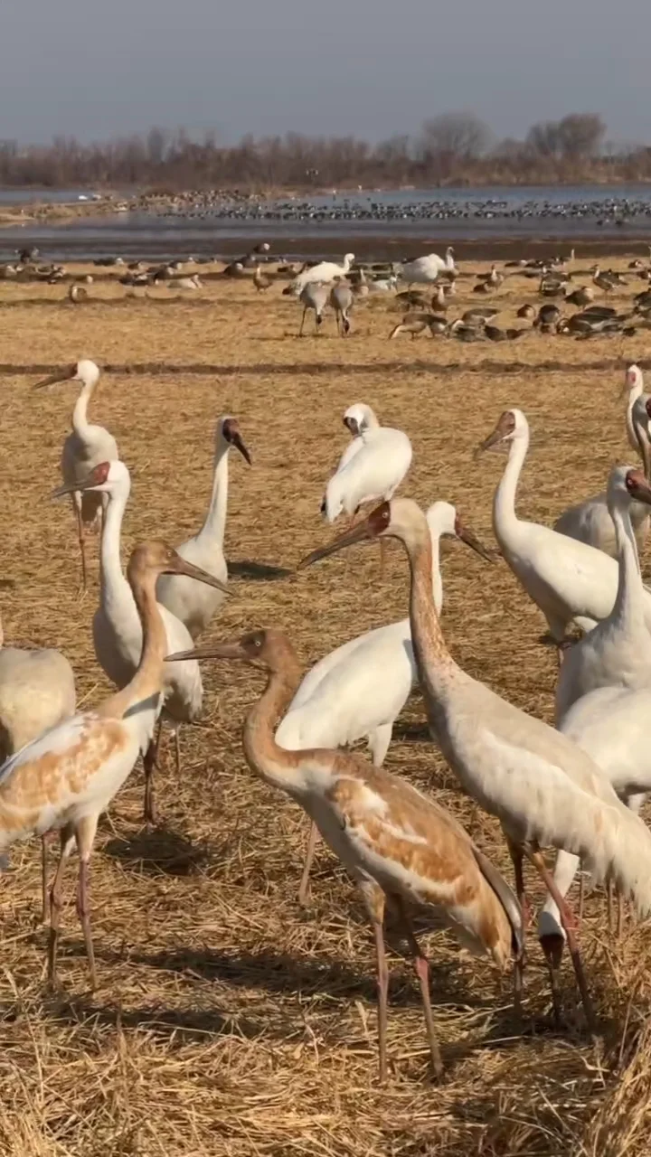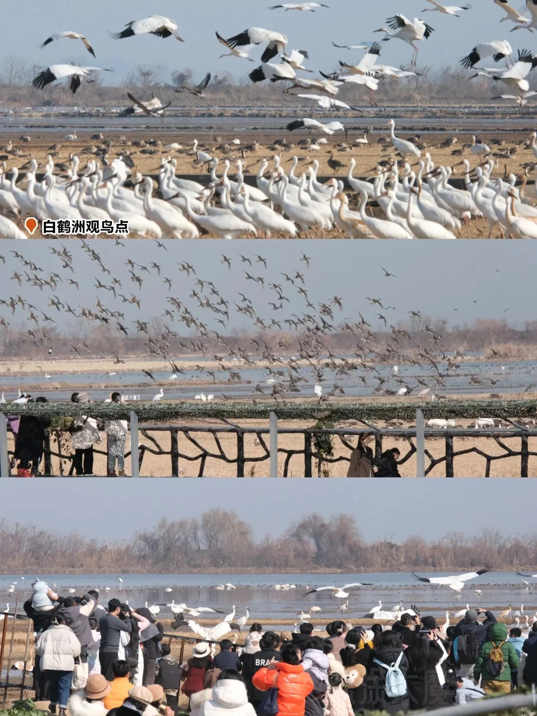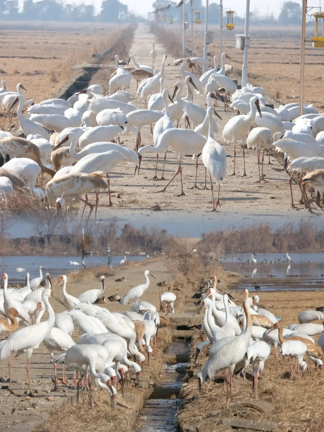 推荐:沿着大坝走,成片的天鹅在湖里嬉戏玩耍,近距离观察小天鹅、列队休整的鸬鹚军团、低头觅食的灰鹤家族;上千只白鹤集体觅食,运气好还能见到白头鹤、白枕鹤;