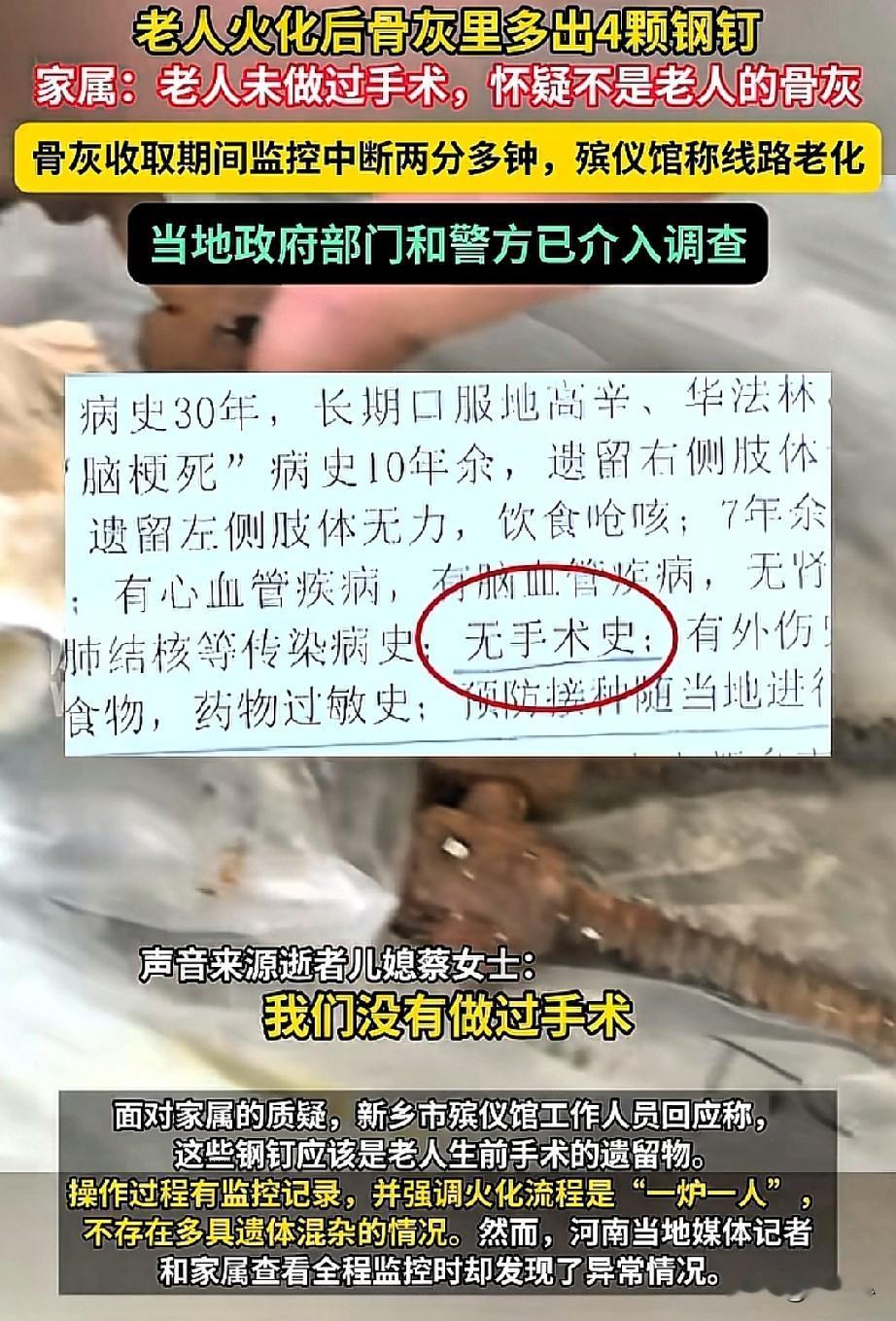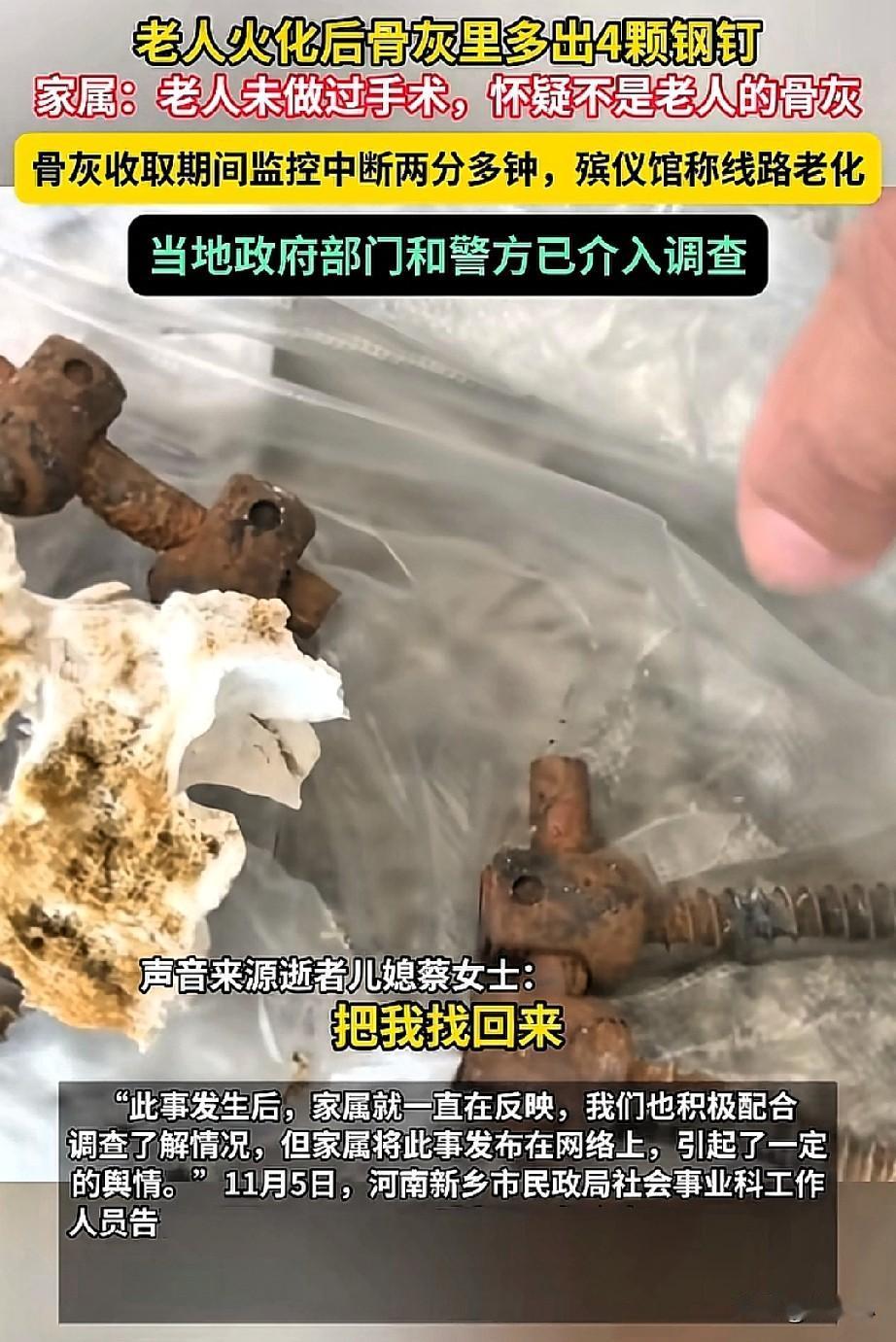 太玄了!河南,一位老人去世后,火化出来后竟然多了4颗钢钉,家属很怀疑这不是老人的骨灰,因为老人从来就没有动过手术,尤其是在取骨灰的时候,监控中断了,这不得不让家属的怀疑越来越大了,至今老人都还没有下葬。 90岁的老人就在今年的10月份离去了,火化后在骨灰里面发现了4颗钢钉,此前老人的衣食照顾都是儿媳妇来照顾,老人身上并没有伤口之类,为了弄清楚家人也前往了医院里面查看记录。 根据报告和检查结果,老人并没有手术史,所以老人身上不存在钢钉之类的金属,也就是从这一方面,家属断定了这骨灰并不是老人的。 对于,这样的现象,殡仪馆的工作人告知,都是按照流程走的,并不存在混乱的现象,不过在查看监控的时候,老人火化完之后确实是没有钢钉的。 就在家属去接收的时候,监控突然就中断了两分钟,恢复好后,家属进去接的时候就发现有这个钢钉了。 对于,监控中断,工作人人员告知,是因为线路老化的原因,对此家属却不相信。 对此,很多网友可是议论纷纷的,看着我都是汗毛直竖啊。 如今,各个相关部门已经都介入了,相信很快就会有结果的。 不过也能理解家属,都想老人落叶归根,在我们这边有说法,老人下葬顺的话,会保佑子孙的,如果有意外的话,就会家宅不宁。 不知道你们那边有没有这样的说法。