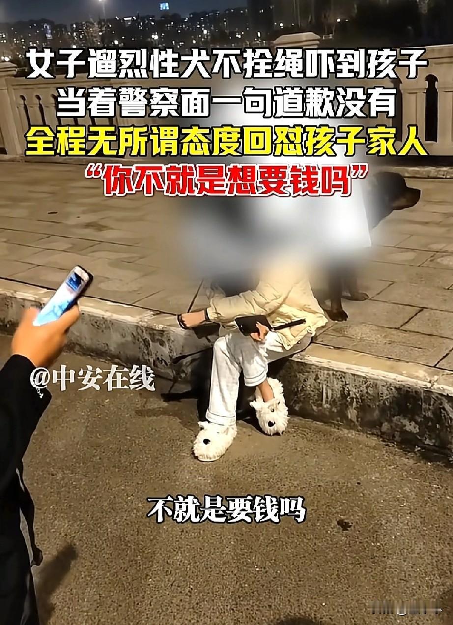 太恶劣了!江苏,一女子遛狗不牵绳,吓到孩子,不仅没有觉得自己的错,反而还当着帽子叔叔的面怒怼家长,“你不就是想要钱吗”?家长被这女子的态度气的不轻。网友:不是所有爱狗人士都是好人,大部分都是垃圾。只爱自己的喜好,不是爱生命。 这话虽然尖锐,却道出了许多人的心声。 一位家长带着孩子遛弯,突然一条烈性犬朝着孩子跑了过来,孩子被吓的哇哇大哭,家长也是气愤不已,这么大的狗竟然不拴绳,吓到了孩子。 家长就找狗主人理论,要求道歉,奈何这个狗主人不仅没有意识到自己的举动,给别人带来了麻烦,甚至还在那里嘲讽家长,家长看到这么嚣张的女子直接报警。 然而,当帽子叔叔过来后,人家根本就不怕,坐在那里,帽子叔叔让狗主人带孩子去检查一下就行了。 狗主人态度懒散的说道,检查多少钱,直接转给你,不就是想要钱吗? 家长一听更是生气了,当着帽子叔叔的面,还这么的嚣张,直接曝光在网上,视频中可以看到,家长并不是想要钱,他们只是想要一句道歉罢了。 此事引起了热议,有的网友说,这家长也是小题大做了,不依不饶的,咬到打针就行了,没咬到就走,这样搞没意思。 也有网友表示,遛狗不拴绳确实很可恶,我每次下楼遛我家狗,看到大狗不拴自己也挺害怕,大狗主人还说我家狗不咬人,就那个挺无语。 养狗没啥,但你的狗吓到人家了,就是你的不是了,其实,很简单的一个问题,一句道歉的事儿,大家非得弄得复杂。