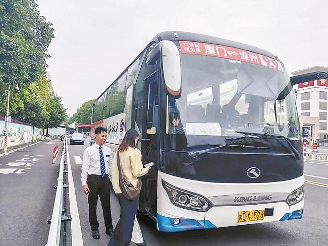 本报讯(报业集团记者李妙珠文/图)“这条专线票价实惠,站点覆盖广,前往厦门更便捷,下午返程票我都买好了!”11月3日上午10时许,漳州市民黄红在漳州市卫生职业学院南门,就近乘坐厦漳便民专线前往厦门访友。