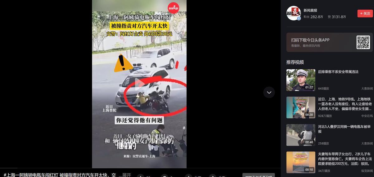 上海一大妈骑电瓶车闯红灯,结果在交警眼皮子底下,被直行小车撞倒!不料,大妈不仅不认错,反而说是对方全责,理由是他开太快了!交警没有听他的一面之词,而是对大妈一顿教科书般说教,然后认定大妈“闯红灯”全责!网友:建议全国这种事件都这么处理! 事情的来龙去脉,都被路口监控拍得清清楚楚,视频里早高峰的路口刚切换信号灯,红灯刚亮起,大妈瞅着路口车流不多,脚下一拧电门就猛冲了过去。 电瓶车刚窜到路口中间,一辆正常绿灯直行的小车就驶了过来,司机压根没料到会有车辆闯红灯横穿,仓促间根本来不及踩刹车,“砰” 的一声闷响,直接撞在了电瓶车侧面,大妈连人带车重重摔在地上,幸好没受重伤只是有些磕碰。 巧的是执勤交警就在旁边岗亭里,听见碰撞声立马冲了出来,没等交警开口询问,大妈已经从地上爬了起来,拍了拍身上的灰尘,指着小车司机就高声嚷嚷:“你开那么快干啥!看见我过来不知道减速吗?这事儿肯定是你的全责!” 面对大妈的 “倒打一耙”,交警没有被情绪带偏,也没有含糊其辞,而是指着头顶的红灯和路口的监控设备,语气坚定又条理清晰地说道:“阿姨,咱先不说谁撞谁,首先你闯红灯了,这就是你的过错,他是正常绿灯直行,全程没有任何违规操作,假设他有别的过错,那该他承担的责任他跑不了,但现在他一个问题都没有,怎么能让他承担责任呢?不可能因为你骑的是电瓶车,就不管对错都让对方担责,规矩面前人人平等。” 一番话说得有理有据,大妈脸上的怒气渐渐消了下去也没再争辩,最终交警依法认定大妈承担本起事故的全部责任,同时对她闯红灯的违法行为作出了罚款 50 元的处罚决定,整个处理过程不偏袒、不敷衍,既守住了法律的底线,也让人心服口服。 这段视频传到网上后,很快就引发了网友的热烈讨论,点赞量噌噌往上涨,有网友直言:“这才叫一碗水端平!不管你是骑电瓶车的还是开汽车的,不管你是老人还是年轻人,违法了就得担责,早该这么办了!” 还有网友感慨:“终于不是‘和稀泥’式处理了!以前总听说‘机动车要让非机动车’,可这也得看谁违法吧?明明是自己闯红灯,还反过来喊冤要赔偿,就该这么直接怼回去,让违法者付出代价!” 其实在现实生活中,不少人心里都藏着一个歪理:“我骑电瓶车是弱势方,出了事儿就该汽车担着。” 哪怕自己闯了红灯、逆了行,甚至违规载人载物,一旦发生事故也敢理直气壮地向机动车司机索要赔偿。 可交通规则的本质是 “权责对等”,红灯面前人人平等,不管你骑的是电瓶车还是开的宝马,不管你是行人还是司机,只要违反了交通规则,就是过错方,错了就得担责,这是最基本的社会规矩,也是保障每个人出行安全的底线。 这位交警的处理之所以被全网叫好,核心就在于他没有搞 “各打五十大板” 的和稀泥,没有被 “弱势” 的标签绑架,而是清清楚楚地把 “弱势” 和 “违法” 掰扯明白了。 大妈觉得 “汽车该让着电瓶车”,本质上是把 “同情弱势” 和 “纵容违法” 这两个概念搞混了,这位上海交警的 “教科书式处理”,不仅纠正了一起交通违法,更传递了一个重要的信号,规则就是规则,违法就要担责,没有例外没有特殊,这不仅是对守法者的保护,也是对违法者的警示,更是对 “谁弱谁有理” 歪风的有力纠偏。 (信息来源:新闻晨报)