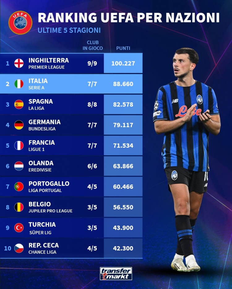 直播吧11月6日讯德国转会市场列出了各国联赛的欧战总积分排名,英超居首,意甲、西甲二三位。