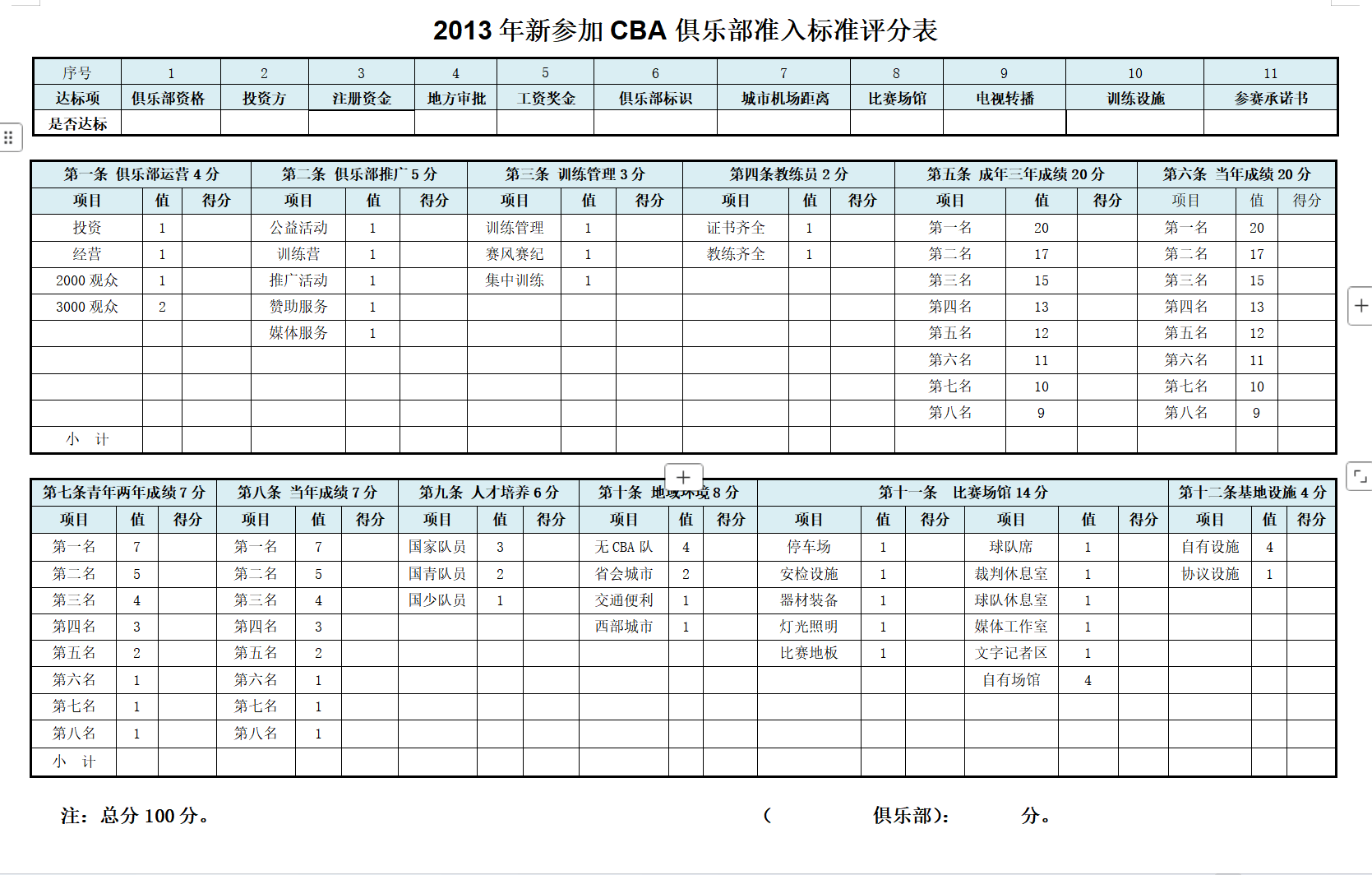 此外,在2013年还颁布了CBA俱乐部准入标准评分表,从表中可以看到:俱乐部运营、联赛成绩、青年队成绩、基础设施等事项均被纳入评分标准。