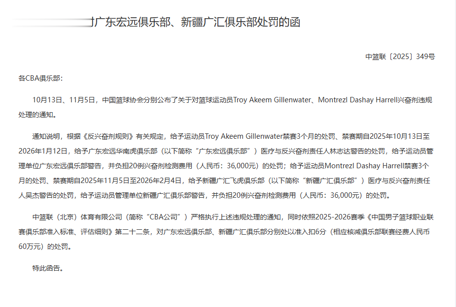CBA官方发布处罚公告,广东男篮和新疆男篮因球员服用禁药事件,被处以分别处以准入扣6分(相应核减俱乐部联赛经费人民币60万元)的处罚。