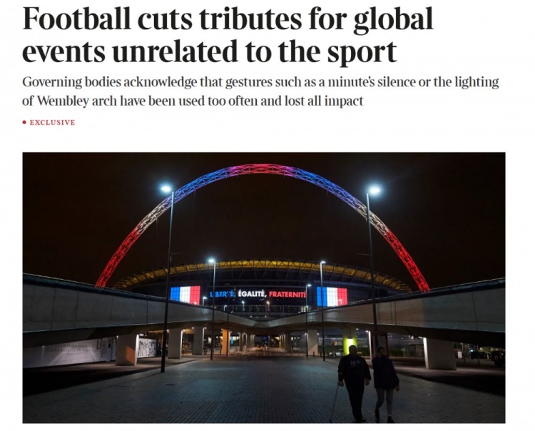 英足总、英超联赛和英格兰足球联赛成立了“世界事件工作组”(WEWG),以指导英格兰足球对重大世界事件的反应。除非事件与足球有直接关联,否则联赛将不会举行默哀仪式,也不会点亮温布利球场的拱门。