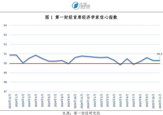 2025年11月,第一财经研究院发布的“第一财经首席经济学家信心指数”为50.3,与上月持平,维持在50荣枯线以上。经济学家们认为,今年我国经济运行平稳,预计能够实现全年5%的增速目标,未来外部环境仍然复杂多变,国内经济应更多关注内需的修复。