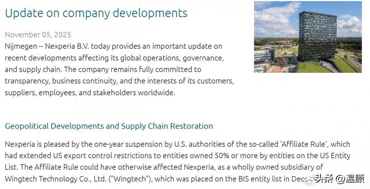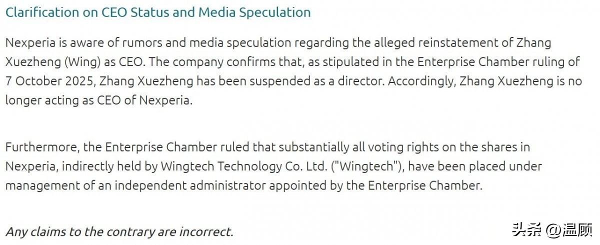 荷兰安世:张学政复职无望,继续断供中国工厂晶圆 2025年11月5日,荷兰安世半导体(Nexperia)发布最新声明称,中国籍高管张学政尚未恢复其CEO职务,同时因中国子公司拒付货款,已暂停向其中国工厂供应晶圆。 安世半导体表示,根据2025年10月7日企业法庭的裁决,张学政已被暂停董事职务,因此他不再担任安世半导体的CEO,任何关于张学政复职的说法均不属实。此外,闻泰科技间接持有的安世半导体股份的几乎所有投票权,已由企业商会指定的独立管理人管理。 关于断供一事,安世称中国子公司自10月13日起脱离公司治理框架、无视全球管理层指令,生产缺乏透明度与监管,导致总部无法保证中国工厂产品的知识产权、技术、真实性及质量。且中国子公司存在无正当理由拒付晶圆货款、擅自使用公司印章、开设未授权银行账户并要求客户回款至该账户、向外部合作方发送含虚假信息的未授权信件等多项违规行为,因此自10月29日起暂停向其中国工厂供应晶圆。 只能说我们对荷兰教育还是太轻了,对强盗,就没必要去谈,就得用拳头说话,一次性打痛它。