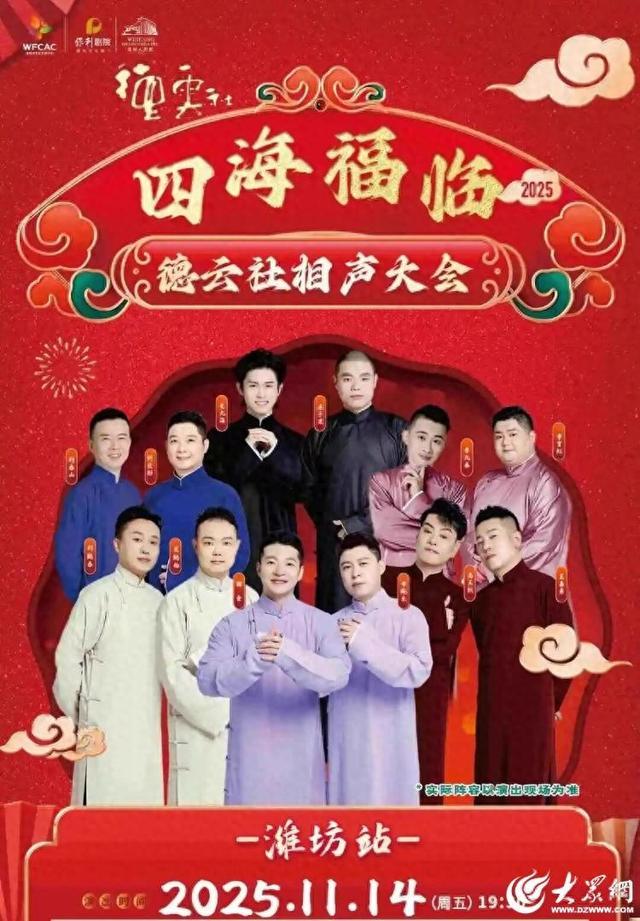 近日,备受瞩目的“四海福临2025德云社相声大会专场演出—潍坊站”正式官宣,将于11月14日19:30在潍坊大剧院欢乐启幕。德云社此次携强大阵容登陆潍坊,将以“说学逗唱”的传统技艺融合现代幽默元素,为当地观众打造一场回味无穷的视听狂欢。
