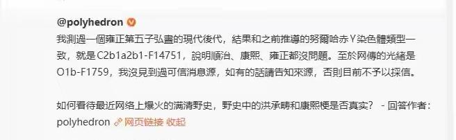 这专家怎么这么急呢?大家吃瓜吃得乐乐呵呵的,突然蹦出来一个专家来辟谣。关键是,仔细看他的辟谣,不仅不会觉得辟谣了,反而只会觉得又添新瓜。 这位中国民大的专家说他测了雍正第五子弘昼的DNA,和努尔哈赤的父系一致,所以就下结论从皇太极到康雍乾都没问题。这位专家是把大家当傻子吗? 仅仅弘昼和努尔哈赤一致,怎么就能证明皇太极康雍乾一致?弘昼从小就被从生母耿氏身边抱走,养到八岁才让耿氏见面,跟耿氏说这是你亲儿子,耿氏能认得清吗,敢说不是吗?完全有一种可能,为了巩固笼络,耿氏亲儿子被拿去和爱新觉罗家的其他支系交换了。 要想真辟谣,就把这些皇帝一个个都测一遍。明朝皇帝都被测完了,比明朝更近了三百年的清朝怎么反而测不了? 说起来,这位严实教授,还是名门之后。曾祖父是南开大学创始人严修,盐商世家,1882年22岁中进士,最高做到过晚清的一品大员。
