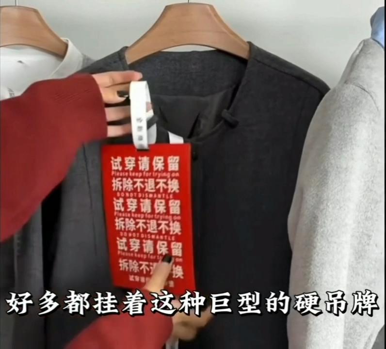 为了防止顾客“白嫖”,商家也是拼了[笑哭][笑哭]。不少买家,买了新衣服,尤其是女装,带着吊牌穿着去参加party、旅游拍照,尤其是汉服系列,用过了就退货,衣物带着残留的汗渍和味道、化妆品的痕迹退回给卖家,这样的“白嫖行为”着实让商家头疼不已。 近日网上出现了一款“巨型吊牌”,此吊牌有A4纸那么大,极其夸张,且硬度比较大,穿着极为不舒适,堪称“令人绝望的吊牌”,有商家称:之所以做的这么夸张,就是为了降低买家恶意退货行为。 其实我也很赞成,免得哪天自己买到的是不知道别人穿了多少次的衣服。个人觉得,如果是认为质量不好,穿着不合适或者效果不好,这些原因退换货无可厚非,但是那种原本衣服质量就很好而且穿着还好看,她们穿着参加重要活动又退的白嫖行为就是应该抵制,这种巨型吊牌挺好的,应该还是能够防止一些不道德的行为的,双手赞成[赞][赞]。
