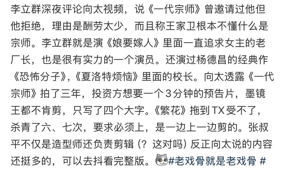 李立群也开炮王家卫了。 11月5日,向太发视频谈到导演王家卫近日争议传闻,表示