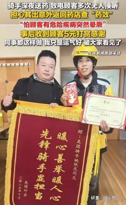 这年头,最动人的故事往往来自最平凡的坚守。当一个平台开始为善良定价,我们看到的不仅是企业担当,更是一个温暖社会的良性循环。 还记得前两天冲上热搜的甘肃骑手姚欣龙吗?半夜送药时发现顾客失联,这个00后小伙在寒风里守了十几分钟,不放心又跑回药店确认药品用途。直到弄清楚只是普通雾化药,才松了口气。 事后他在社交媒体淡然回应:"我只是做了件微不足道的小事,我们同事每天都在做类似的事,只是我运气好被大家看到了。"正是这份质朴的责任感,收获了近10万点赞。 然而,正是这些“微不足道的小事”,在这个快节奏、功利至上的社会中,显得尤为珍贵。姚欣龙的故事像一股清流,冲刷着浮躁的心灵,让我们重新审视那被忽略的善良和责任。 你是否曾在深夜的街头,看到过陌生人因为一句温暖的话语而笑逐颜开?是否也曾在日常的琐碎中,默默付出却未曾被人察觉?其实,善良从不需要华丽的辞藻,也不一定要轰轰烈烈,它就藏在我们生活的每一个细节里。姚欣龙用行动告诉我们:只要心中有温度,就能点亮别人的生命。 更令人深思的是,平台开始为善良“定价”,这背后折射出的是社会对善意的认可和尊重。过去,我们习惯了“善行无声”,如今,善良被赋予了价值,成为一种可被传递、被激励的力量。这不只是对个体的肯定,更是一场社会责任感的觉醒。每一个像姚欣龙一样的普通人,都值得被这个时代记住,因为他们用点滴善意,铺就了一个更温暖的社会。 而这背后,隐藏着一个深刻的本质:善良不是天生的天赋,而是我们每个人都可以培养的品质。只要愿意多一些关注、多一些责任感,平凡的日子也能变得不平凡。这个世界需要更多像姚欣龙一样的“平凡英雄”,他们用行动诠释了责任与温暖的意义。 读到这里,你是否也在心底暗暗感慨:我们每个人都可以成为那个传递温暖的人?或许,下一次在公交车上为老人让座,或是在超市为陌生人拿起掉落的东西,都是一种善良的体现。善意不需要多大,只要你愿意伸出手,就能点亮别人的生活,也让这个社会变得更加美好。 让我们为这些“平凡中的伟大”点赞,为那些默默付出、用行动温暖他人的人喝彩。因为,善良从不孤单,它会在我们每一个人的心中生根发芽,开出最美的花。你我都可以成为那个传递温暖的力量,只要愿意开始。头号周刊 平凡的励志故事