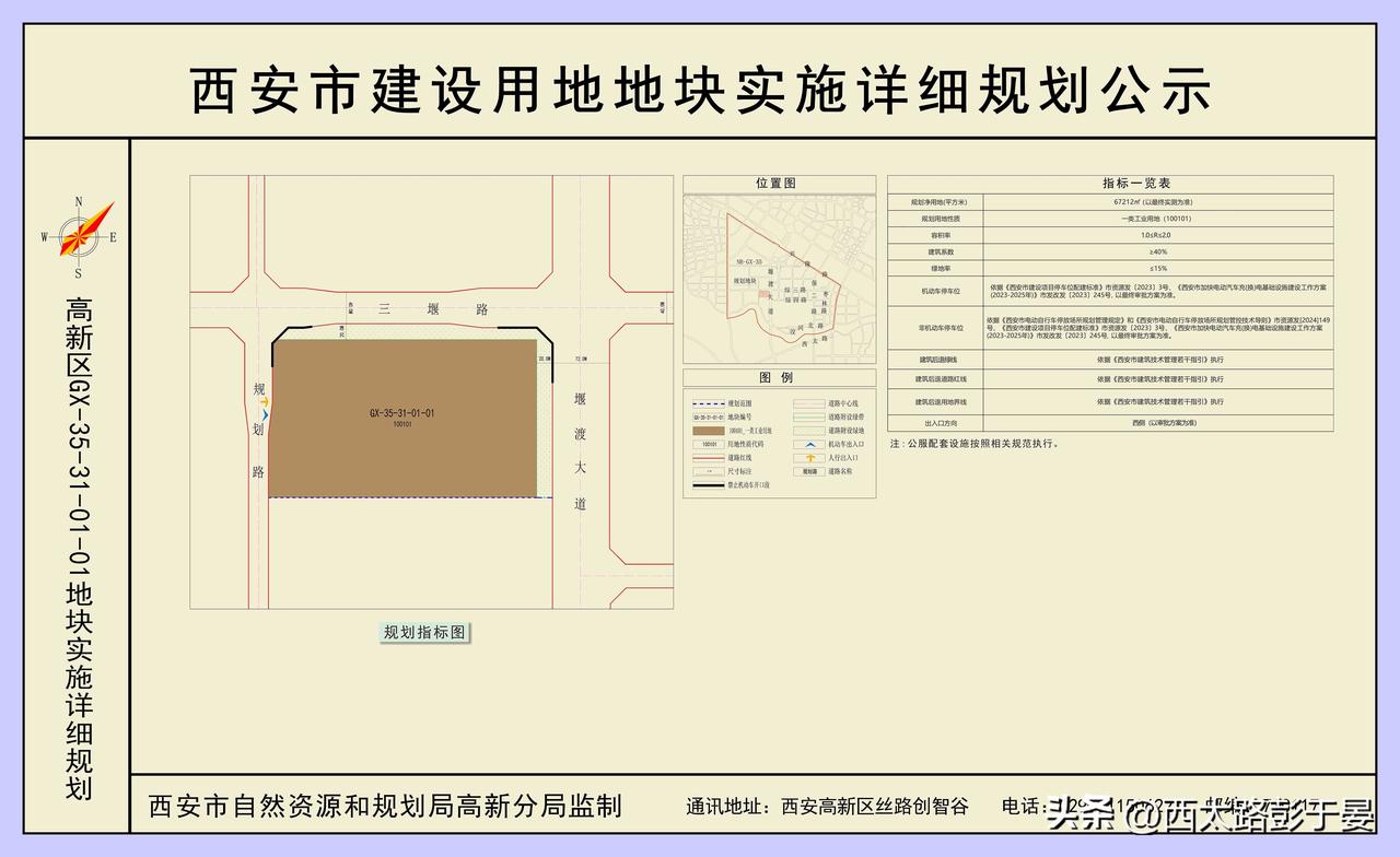 关于高新区GX-35-31-01-01、GX-13-21-02地块实施详细规划公示(公示期限7天) 现就高新区GX-35-31-01-01、GX-13-21-02两个地块实施详细规划公示如下: 1、GX-35-31-01-01地块位于三堰路以南,堰渡大道以西。宗地具体指标如下:用地性质为一类工业用地(100101),容积率1.0≤R≤2.0,建筑系数≥40%,绿地率≤15%。 2、GX-13-21-02地块位于纬十七路以北,上林苑八路以西。宗地具体指标如下:用地性质为一类工业用地(100101),容积率1.1≤R≤2.0,建筑系数≥40%,绿地率≤15%。 自规划条件指标方案公示开始之日起7天内,相关利害关系人及广大群众对该规划设计方案有异议或意见,可于公示期内通过电话或电子邮箱的方式提出意见或建议,我局将依照相关法律法规核实后依法履行相应审批程序。 公示期限:2025年11月5日至2025年11月11日