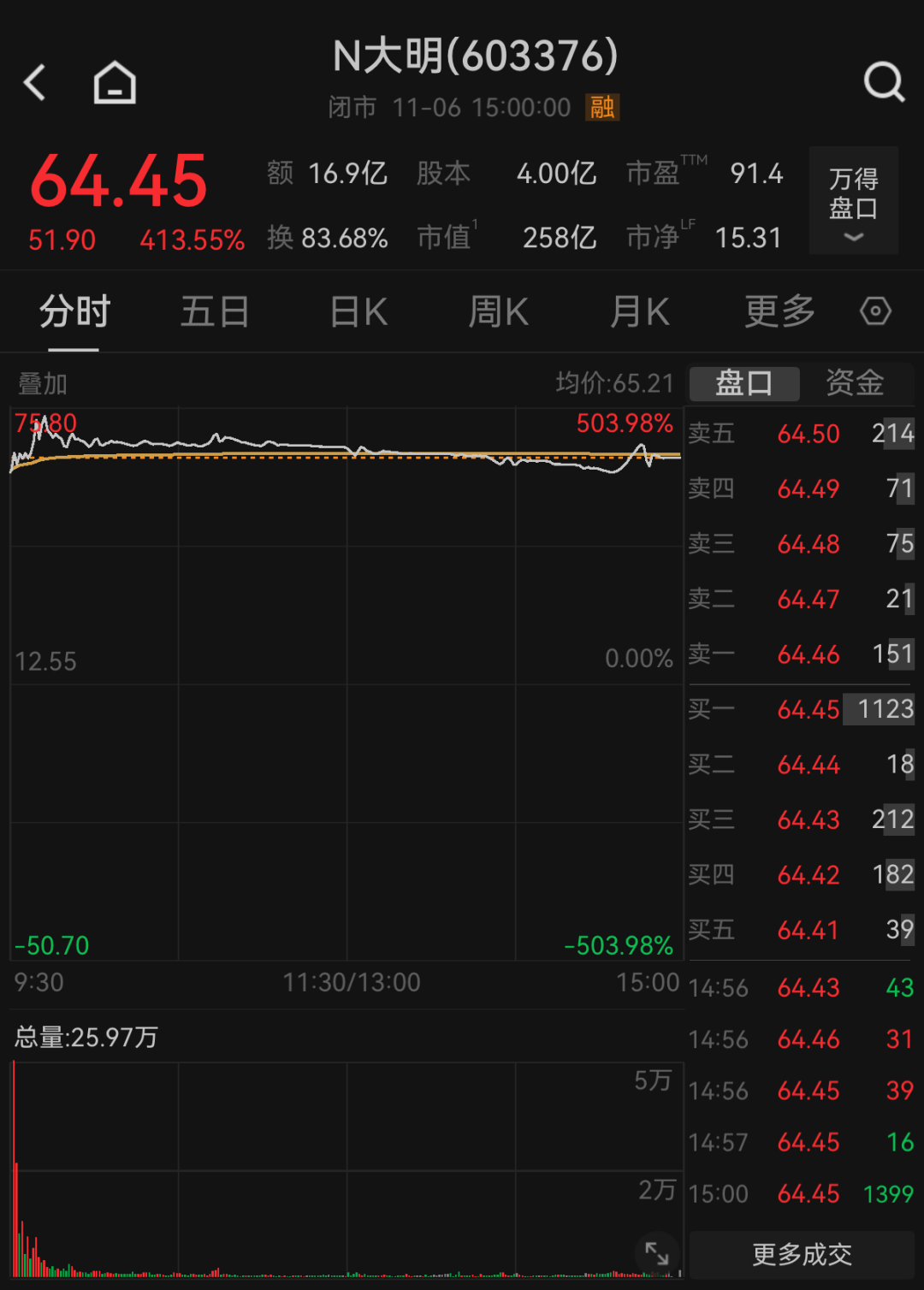 上市首日,大明电子开盘报61.10元/股,较发行价12.55元/股上涨386.85%;盘中最高触及75.80元/股,上涨503.98%;收盘价64.45元/股,上涨413.55%。公司上市首日总市值一度突破300亿元。