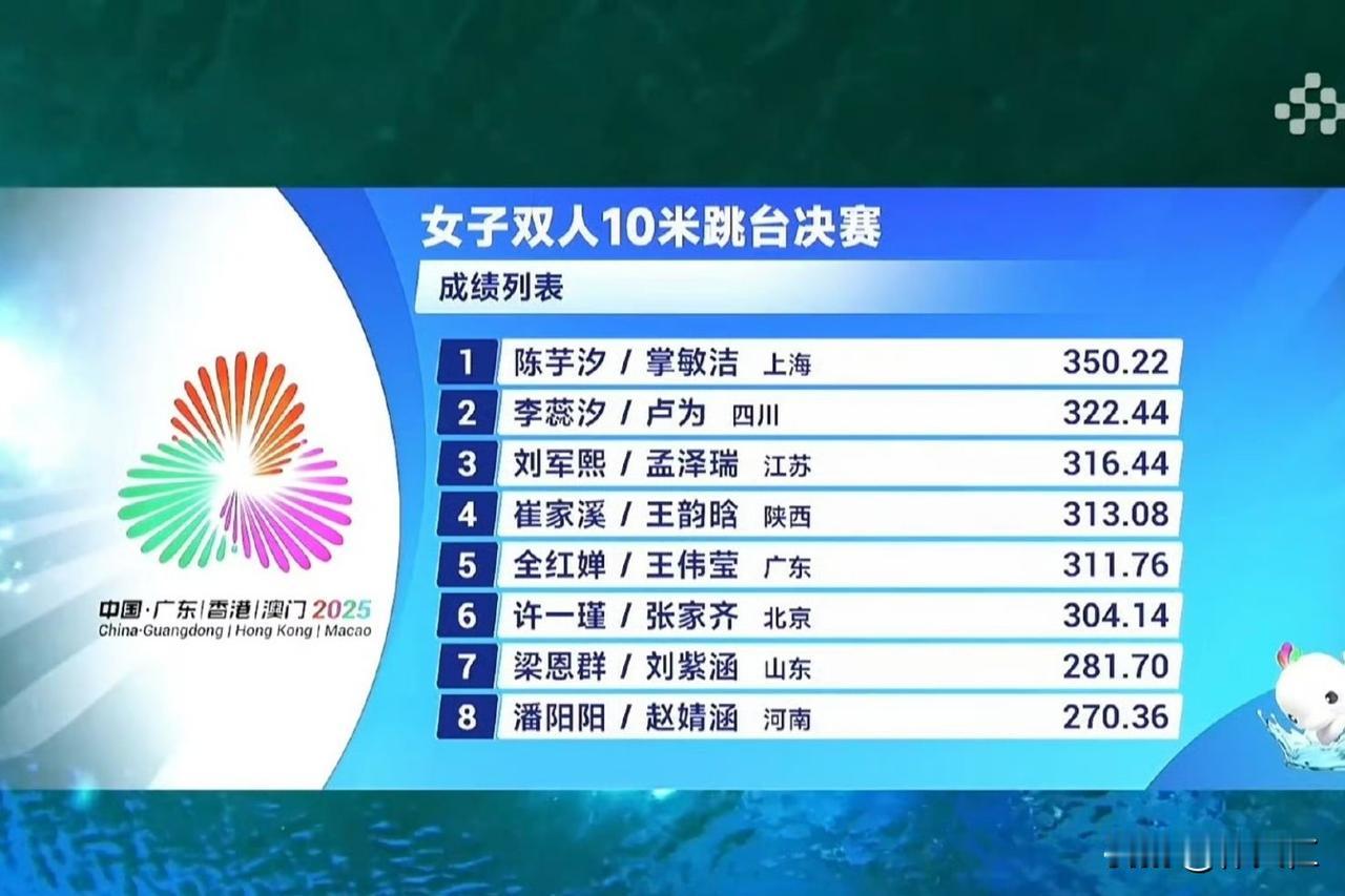 五跳具体得分 第一跳(201B):51.00分 第二跳(301B):48.60分(同步性不足导致扣分) 第三跳(107B):72.00分 第四跳(407C):71.04分(动作细节瑕疵) 第五跳(5253B):69.12分(入水效果未达最佳,排名下滑) 总分311.76分,与前四名分差明显(冠军350.22分,季军316.44分)。 关键问题分析 伤病困扰:全红婵赛前脚踝韧带损伤、腰部劳损未愈,比赛中左脚缠满肌贴。其教练何威仪透露她“每天疼得不得了”,动作完成度受限。 配合默契不足:两人搭档仅一个月(王伟莹原主攻跳板),同步性远不及冠军组合陈芋汐/掌敏洁(世锦赛冠军搭档)。 对手强势发挥:冠军组合五跳均分超70分,无重大失误;银牌、铜牌组合总分均超316分,竞争激烈! 💡 赛场细节与舆论反响 暖心互动 王伟莹因末跳失误内疚,全红婵主动拥抱安慰“没关系”,展现团队精神。 公众态度 多数舆论表示理解,强调“健康完赛比金牌重要”,赞赏全红婵带伤拼搏的毅力。 全运收官 此役为全红婵本届全运会最后一战(未参加单人项目),最终以1金(女子团体)和1个第五结束征程。 第五名的结果源于伤病限制、新搭档磨合不足及对手高水平发挥的综合作用。尽管未登领奖台,全红婵突破身体极限的坚持与赛后展现的团队精神,已超越奖牌价值。若未来解决伤病并持续磨合组合,仍有望重返巅峰。