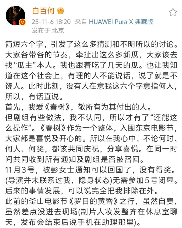 但剧组有些做法,我不认同,所以才有了“还能这么操作”。《春树》作为一个整体,入围东京电影节,大家都是喜悦及开心的。所以在我心中,不论何时、何人、何奖,都该共同庆祝,分享喜悦。在同一时间共同收到所有通知及剧组是否被召回。