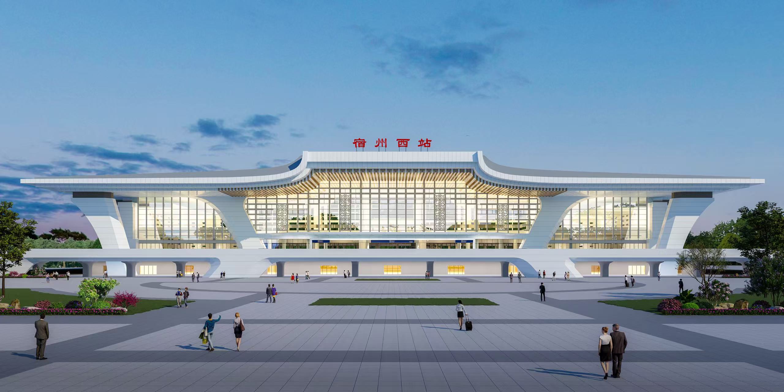 宿州西站站房建筑面积15000平方米,设计理念来源于宿州地标“鹏程”雕塑,整体造型如展翅雄鹰,寓意着宿州端庄大气、开放包容的皖北门户形象。站房屋盖采用悬挑结构覆盖落客平台,流线型挑檐象征蓄势待发的鹰翼,呼应宿州人“鹏程万里”的美好愿景。