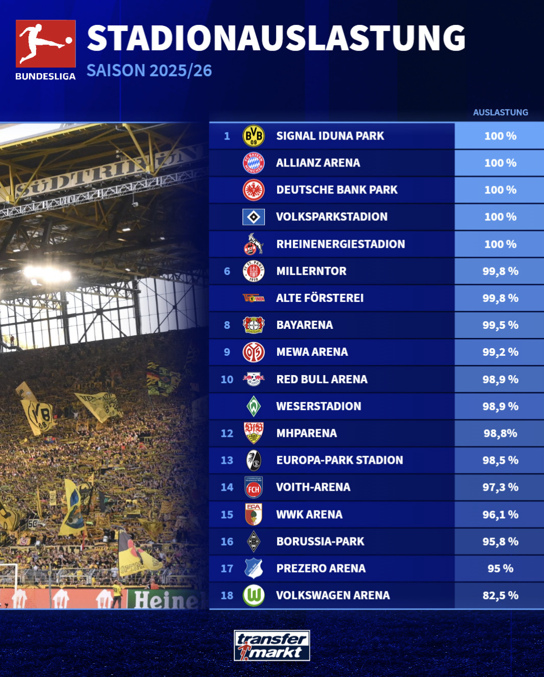 多特蒙德、拜仁慕尼黑、法兰克福、汉堡和科隆的主场均以100%上座率并列第一。除了沃尔夫斯堡的大众球场上座率仅82.5%之外,其他主场均不低于95%。