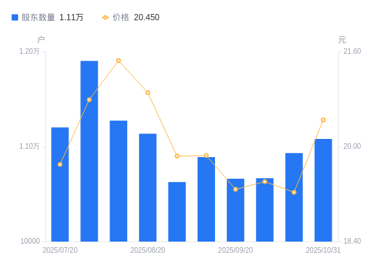 日期A股户数(户)流通A股户均持股数(股)户均持股市值(万元)2025-10-311108110160.0920.782025-10-201093210298.5719.802025-09-301066710554.4120.492025-09-201066110560.3520.362025-09-101089010338.2820.522025-08-311062710594.1321.022025-08-201113610109.8821.142025-08-10112749986.1321.422025-07-31119039458.4319.662025-07-201120310049.4219.80