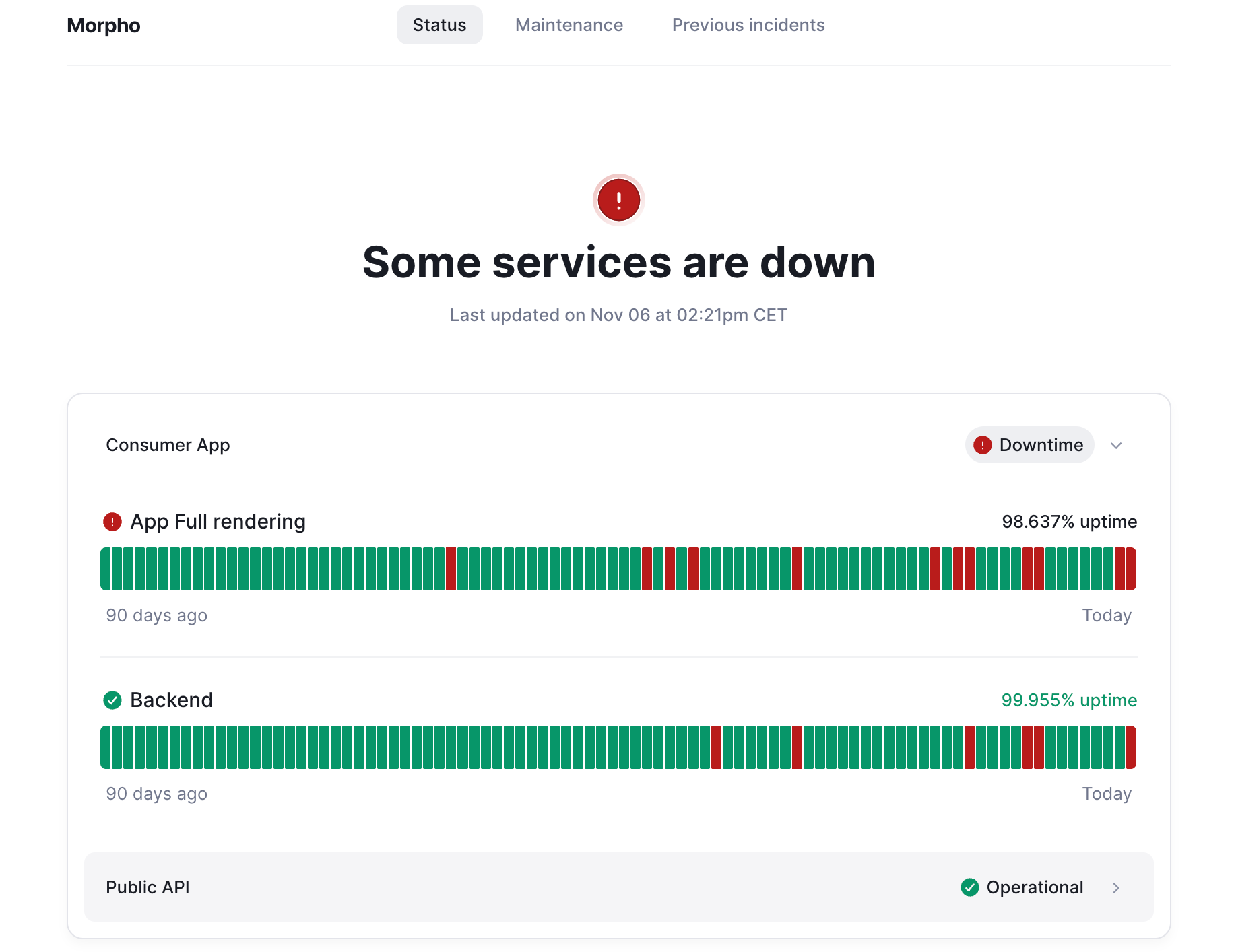 吴说获悉,11月6日20:47通用借贷网络Morpho发生宕机,据其官网状态页面,目前后端问题已修复。