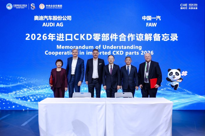 本网讯(记者于洋文/摄影)11月5日,在第八届中国国际进口博览会上,中国一汽与奥迪汽车股份公司签署2026年进口CKD零部件合作谅解备忘录。中国一汽董事长、党委书记邱现东,党委常委、副总经理吴碧磊,奥迪汽车股份公司董事长高德诺博士,奥迪中国总裁、奥迪一汽新能源董事长罗英瀚博士等共同见证这一重要时刻。