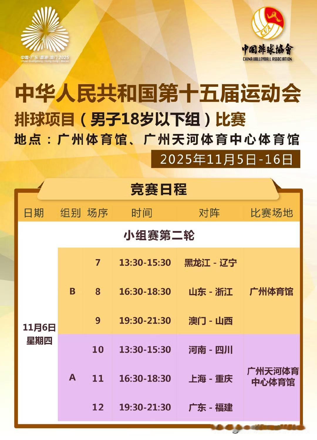[玫瑰][玫瑰][玫瑰]全运会U18男排小组赛第二轮(11月6日)战报: 一,A组: 1,河南0-3四川,四川队两连胜,河南队两连败。 2,上海3-0重庆,上海队两连胜,重庆队0胜1负。 3,广东3-0福建,广东队1胜1负,福建队两连败。 江苏U18男排轮空。 二,B组: 1,黑龙江3-1辽宁,黑龙江队两连胜,辽宁队两连败。 2,山东2-3浙江,山东队1胜1负,浙江队两连胜。 3,澳门0-3山西,澳门队两连败,山西队1胜1负。