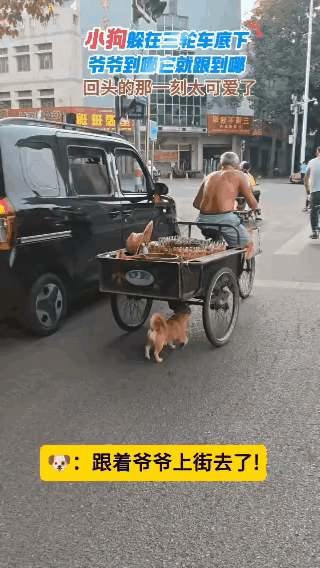 看到这个画面,感觉特别的轻松,感觉特别的温馨,感觉特别的亲切,这个毛孩子非常的聪明,在车辆川流不息的道路上,它知道躲在三轮车的底下跑,也许它感觉这里比较安全,主人蹬着三轮,它在下边奔跑着,形成了一幅和谐的画卷,人与动物和谐相处,这样的城市才有温度!