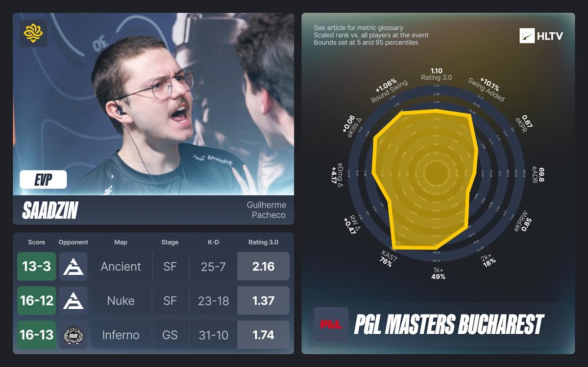 saadzin在Legacy晋级决赛途中引领队伍,胜场场均1.37rating,小组赛表现亮眼(1.20rating),半决赛更有关键爆发(Nuke加时赛23-18,Ancient单图2.16rating,25-7KD)。