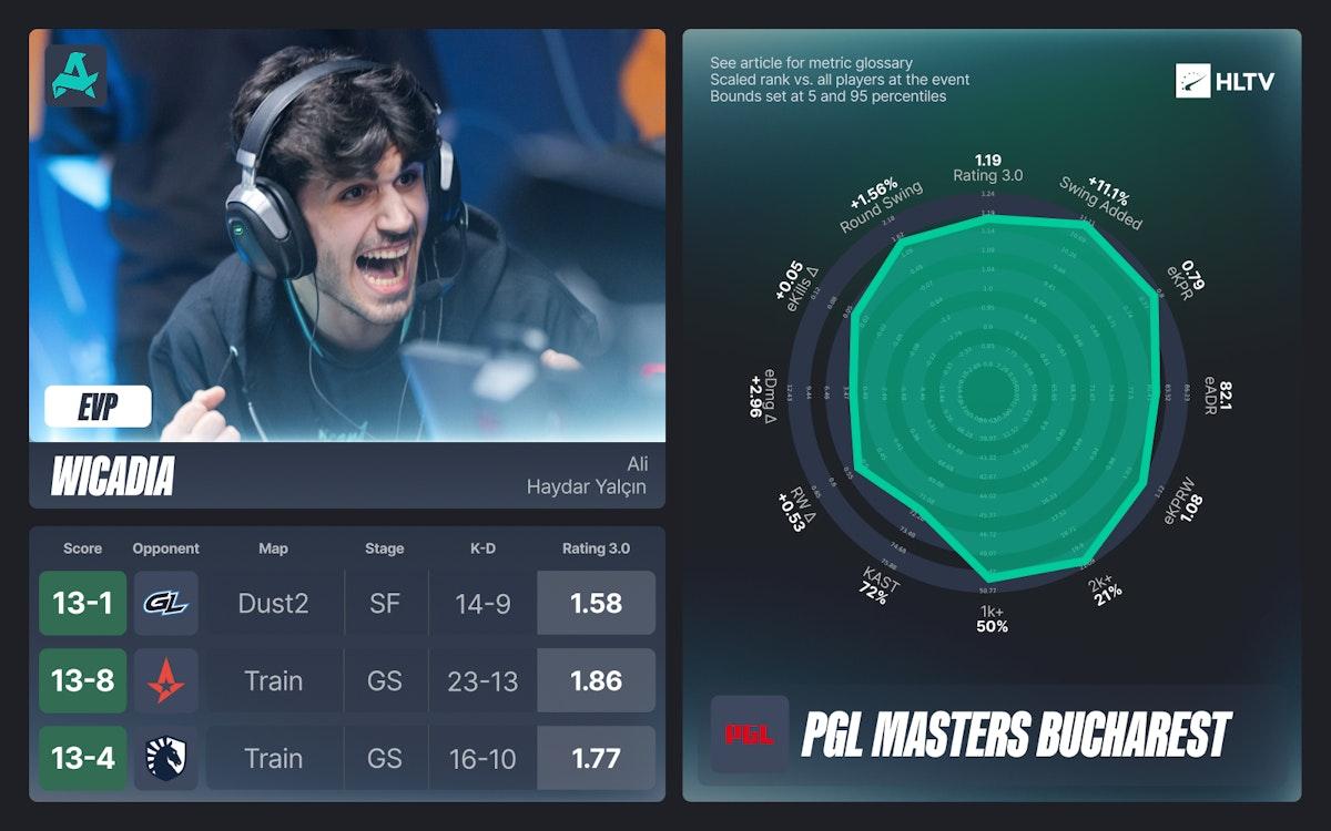 EternalFire青训出身的Wicadia已远非XANTARES的副手,他在布加勒斯特的获胜回合输出(1.11KPRW,110.4ADRW)与XANTARES比肩。