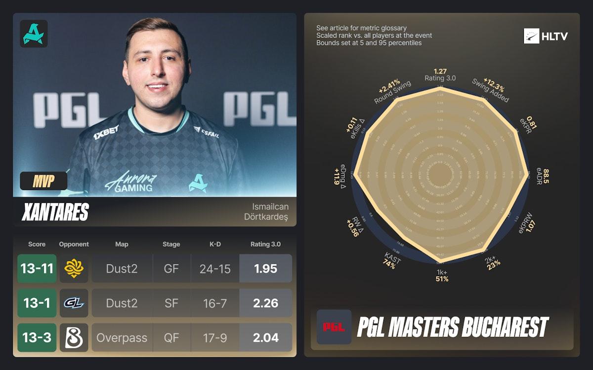 30岁的XANTARES以统治级淘汰赛表现(1.38rating,4次单图最佳)率领队伍前进,斩获生涯首枚线下MVP奖章。