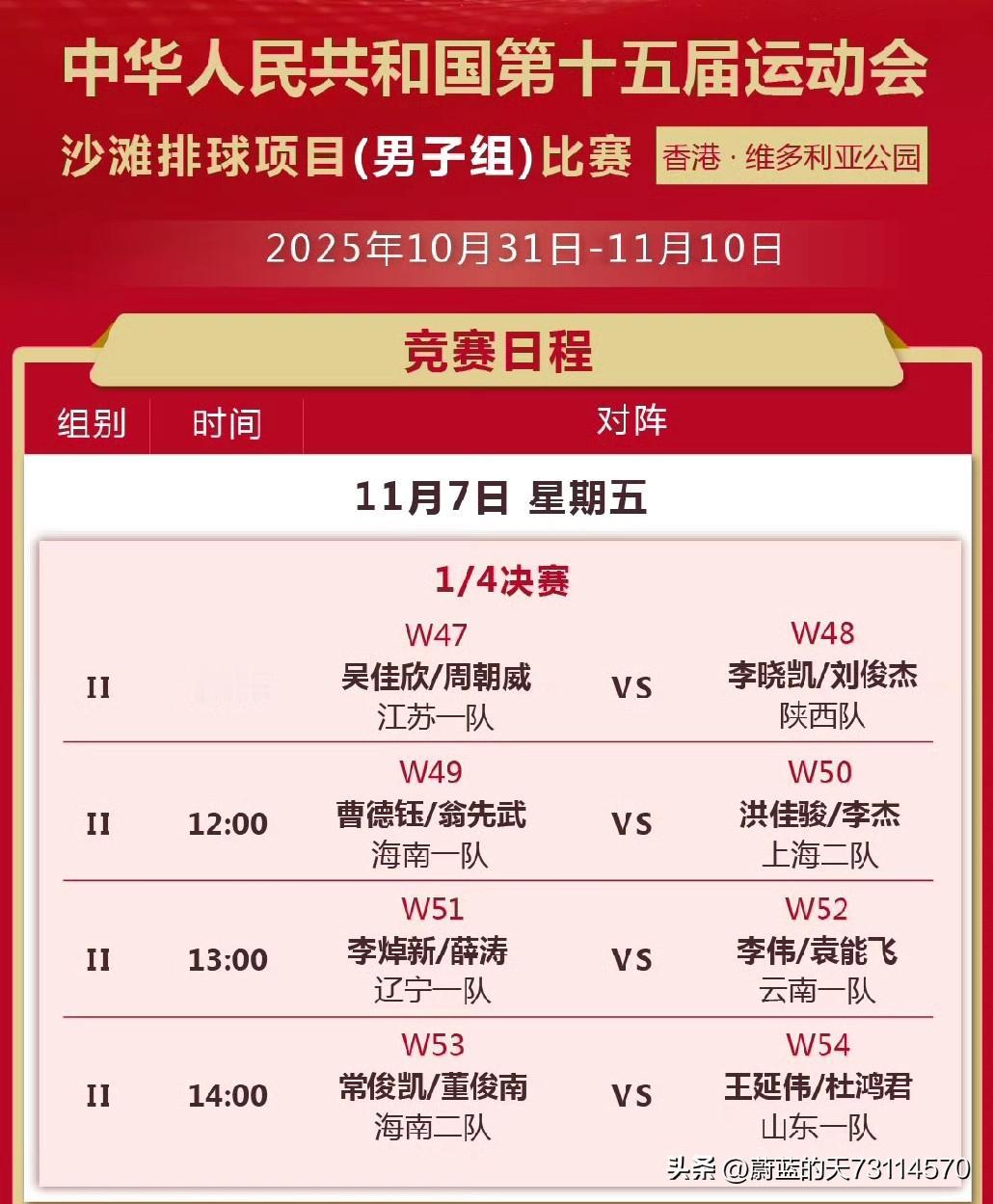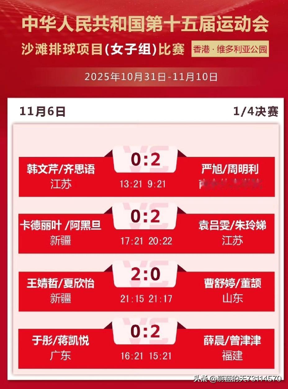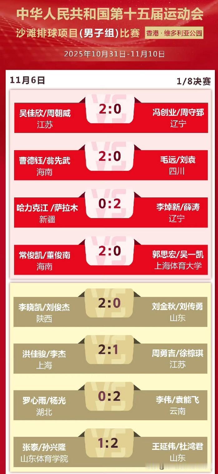 [玫瑰][玫瑰]全运会男子沙排八强,女子沙排四强产生及下一轮对阵情况(详见截图): 一,男子沙排16进8决赛: 1,江苏一队2-0胜辽宁二队 2,陕西队2-0战胜山东二队 3,海南一队2-0战胜四川队 4,上海二队2-1胜江苏二队 5,辽宁一队2-0胜新彊一队 6,云南一队2-0胜湖北一队 7,海南二队2-0胜上海体育大学队 8,山东一队2-1胜山东体育学院队 二,女子沙排8进4决赛: 1,南京体育学院队2-0胜江苏二队 2,新彊二队0-2负江苏一队 3,新彊一队2-0胜山东一队 4,广东队0-2负福建一队