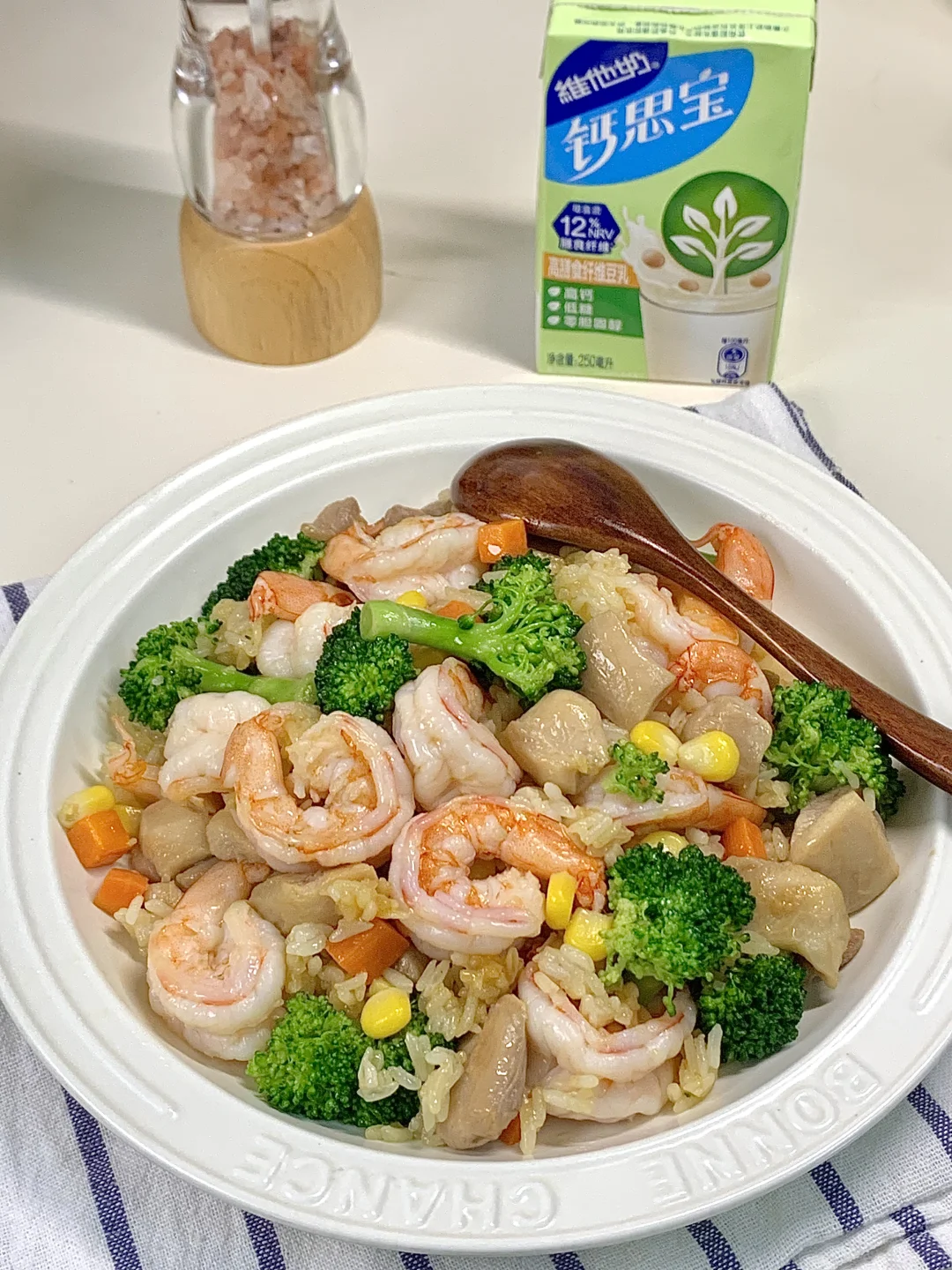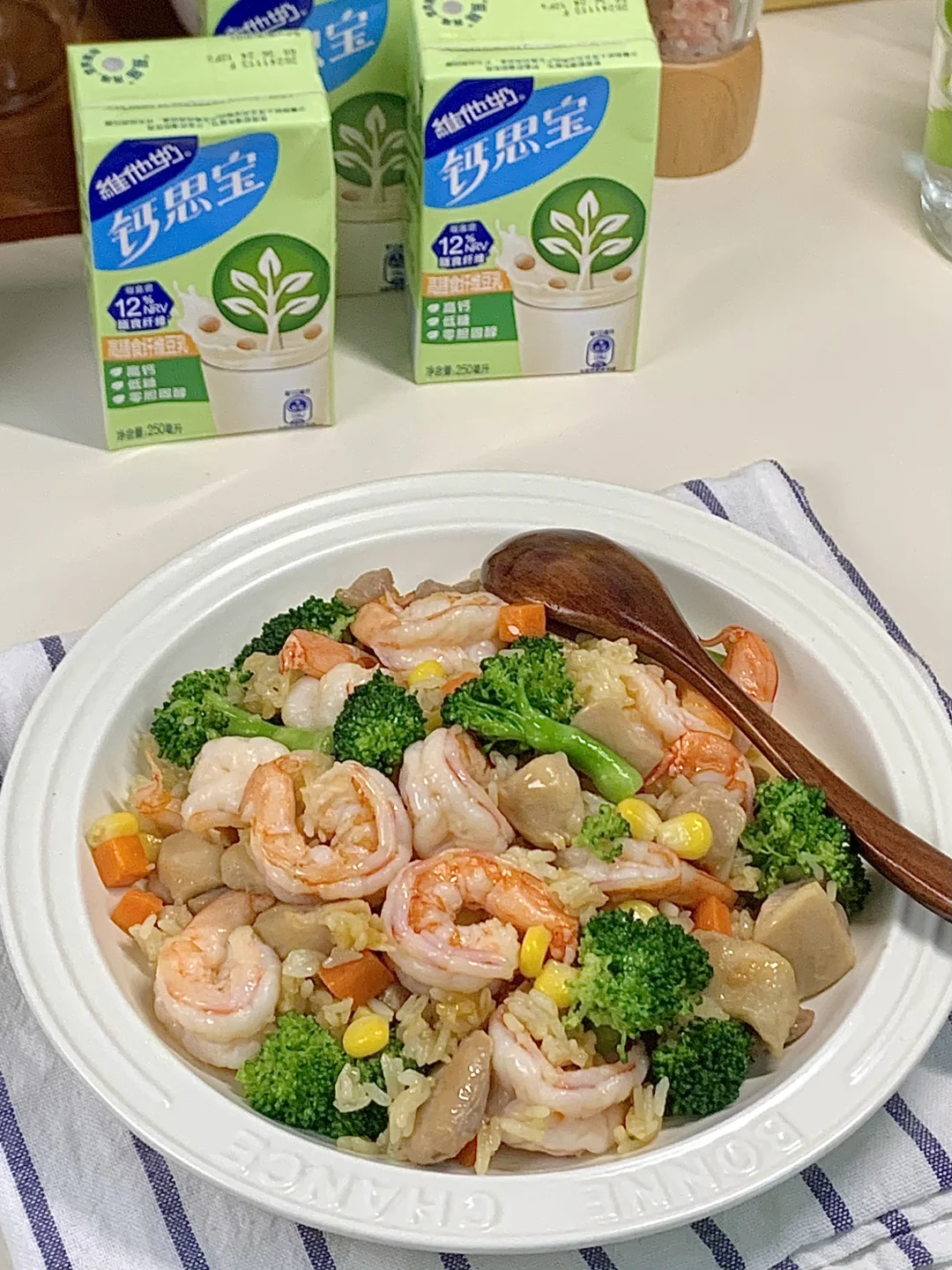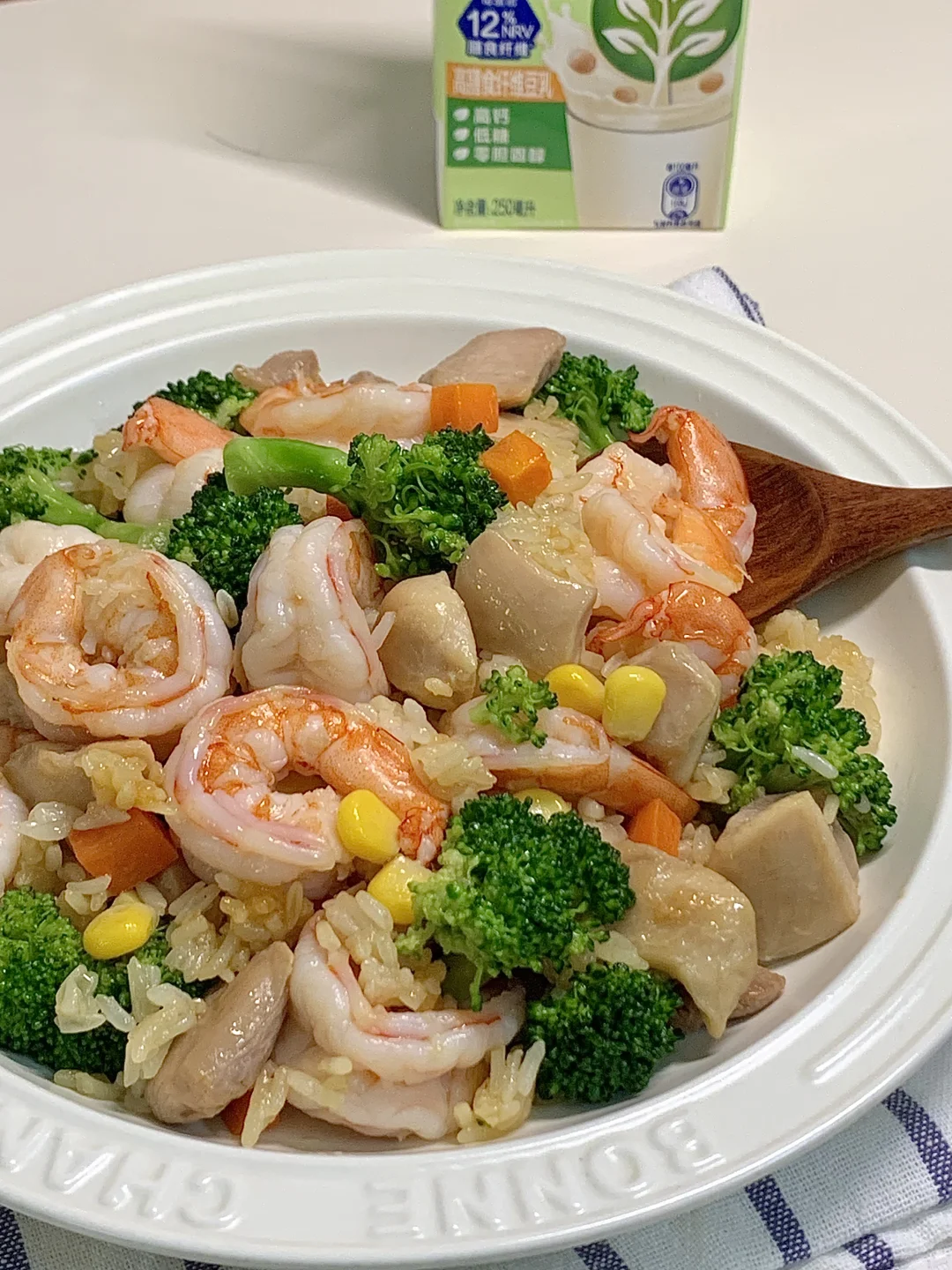 还得是西兰花炒饭!绿色好心情✌️ 清清爽爽~✂︎期放心吃~ 蛋白质有焦香的鸡腿肉和虾仁;美味一锅出! 这个做法营养口感都在线! - 一直在坚持健康饮食,也越来越喜欢干净的食物! 最近很喜欢喝这个维他奶钙思宝高膳食纤维豆奶 靠它度过了略微枯燥的自律期 每天一盒补充一天的膳食纤维 这款豆奶每盒就含12%NRV膳食纤维 一盒所含的膳食纤维相当于3片全麦吐司 低糖低卡0胆固醇,喝完能感觉肚子饱饱的 照着这个搭配吃,吃饱了才有力气掉🥩 每天的膳食纤维不能落下 不爱吃蔬菜水果的姐妹可以试试哦~