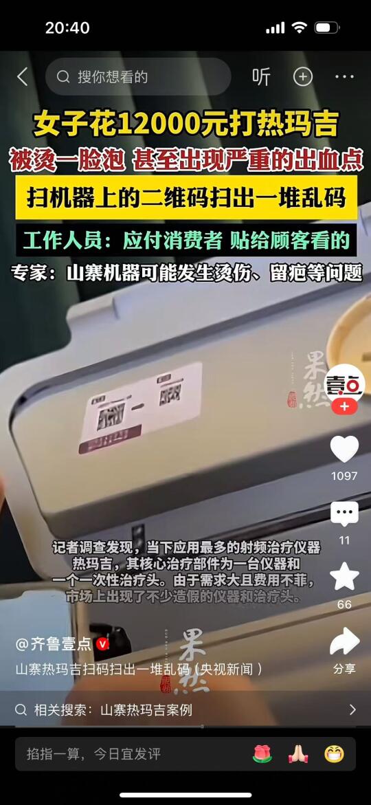 央视新闻的爆料都看了没,有受害者整张脸都烫伤了,真的太惨了!专家都说这都是二级烫伤了,有的都没法完全修复。这一切的一切都是因为用了假的热玛吉!