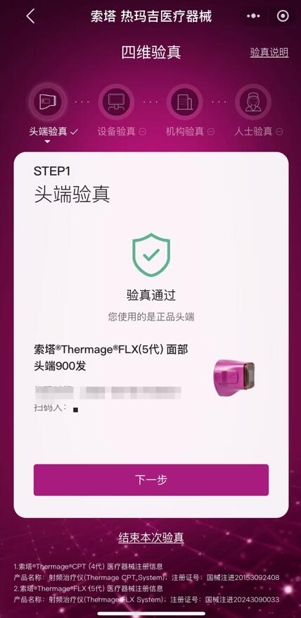 这也就提醒我们做热玛吉之前验真尤为重要,其实验真很简单,不到3分钟就能查询完毕。我们只需要关注官方公众号,确认账号主体是索塔上海,通过公众号进入四维验真小程序,查机构、查Y生,是不是有授权;扫仪器、扫探头,看看是不是正品!做完这四步就能排除假货的可能啦!可以安安心心变美咯!