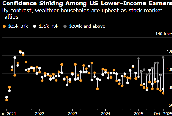穆迪数据显示,收入最高的前20%人群目前贡献了近三分之二的消费支出,创历史新高;而疫情前占消费支出近42%的底部80%人群,如今占比已降至37%。研究机构Circana数据显示,尤其是自今年早些时候宣布加收关税以来,中低收入消费者在服装、玩具等各类商品上的支出均有所减少。