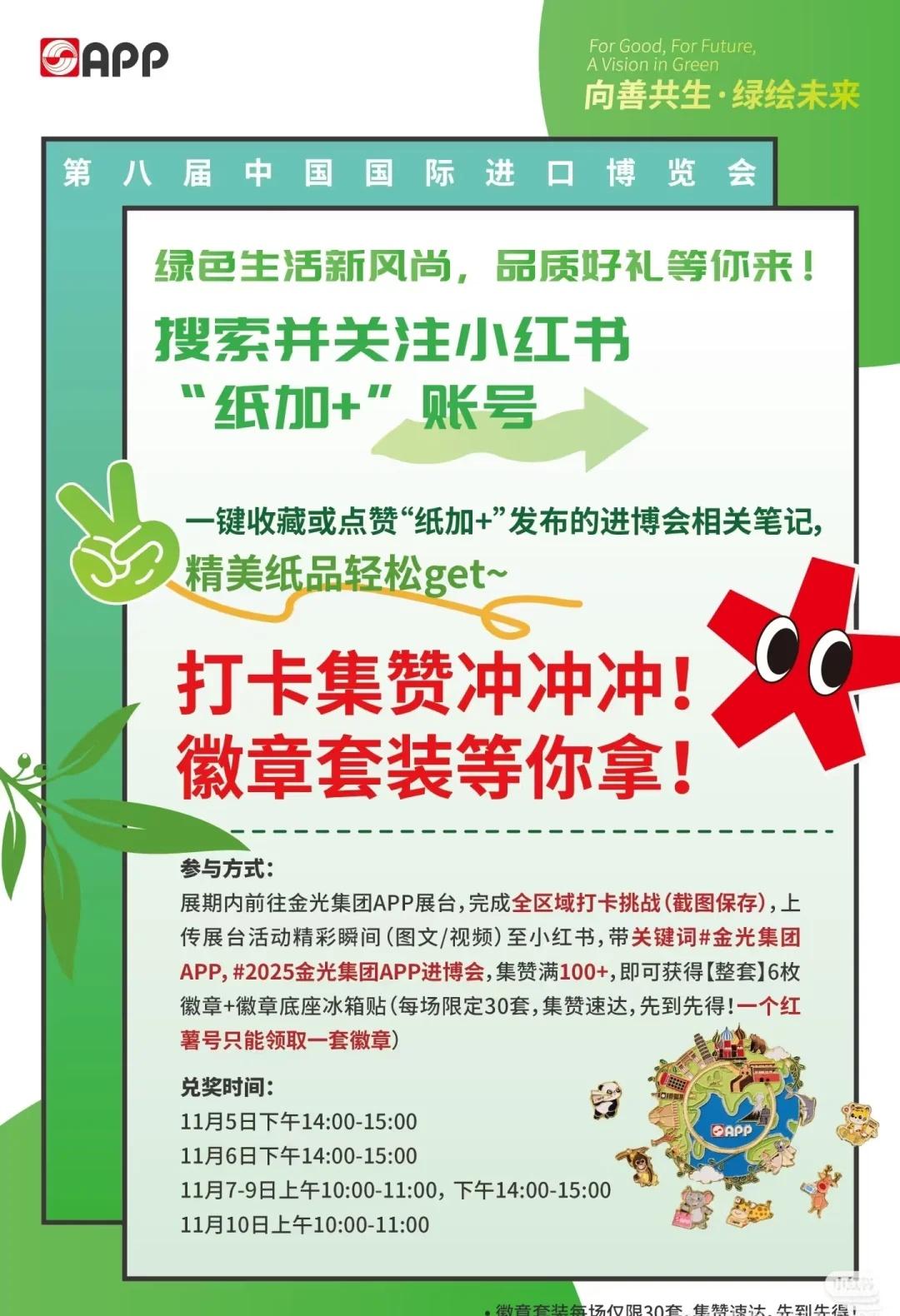 6.2号馆A4-03_金光APP 金光APP进博打卡|攻略快来领取限量徽章 11.5-11.10日,快来进博会金光集团APP展台打卡赢徽章及好礼 礼物超级多、徽章超级zan[赞],等你来贴贴~ 福利一:三连好礼 关注“APP中国”公众号+一键三连进博会相关文章至朋友圈,即可领取清风纸品一份[看] 微信集赞50+可获得徽章[加油] 福利二:展台打卡赢好礼 完成金光集团APP展台活动,即可抽取清风纸巾礼券、盲盒、印尼咖啡、徽章等多重好礼 福利三:集赞领取徽章套章 完成展台全部打卡,和展台来个元气合照,带关键词金光集团APP 2025金光集团APP进博会,发布集赞满100+[赞],即可获得【徽章套章】6枚徽章+徽章底座冰箱贴(每场限定30套,集赞速达,先到先得!一个红薯号只能领取一套徽章) 【活动地点】 国家会展中心(6.2号馆A4-03)金光集团APP展台 【活动规则】 活动规则及领奖时间详见长图海报哦 金光集团APP进博会徽章活动全新改版!今年的规则与往年不同,欢迎探索! 进博会 进博会攻略 打卡 徽章 金光APP 上海进博会 福利