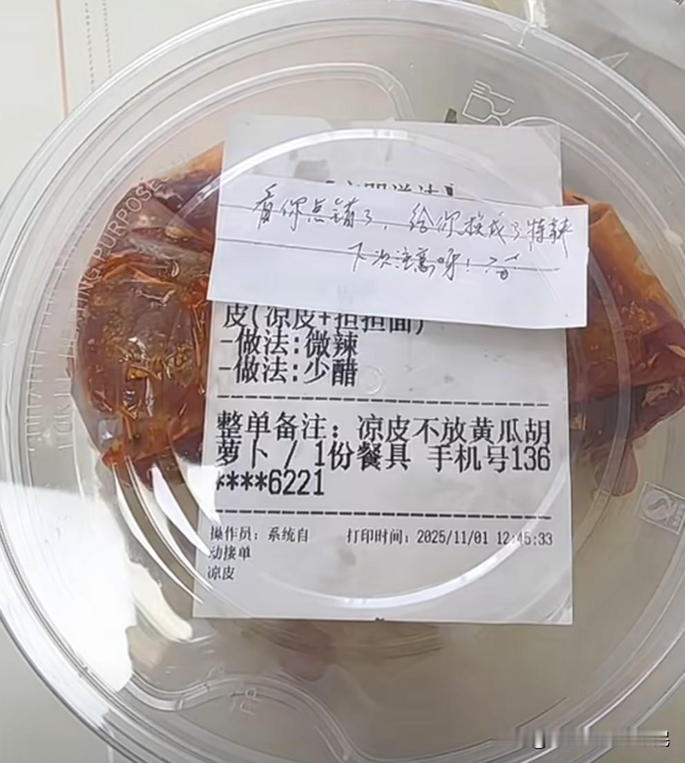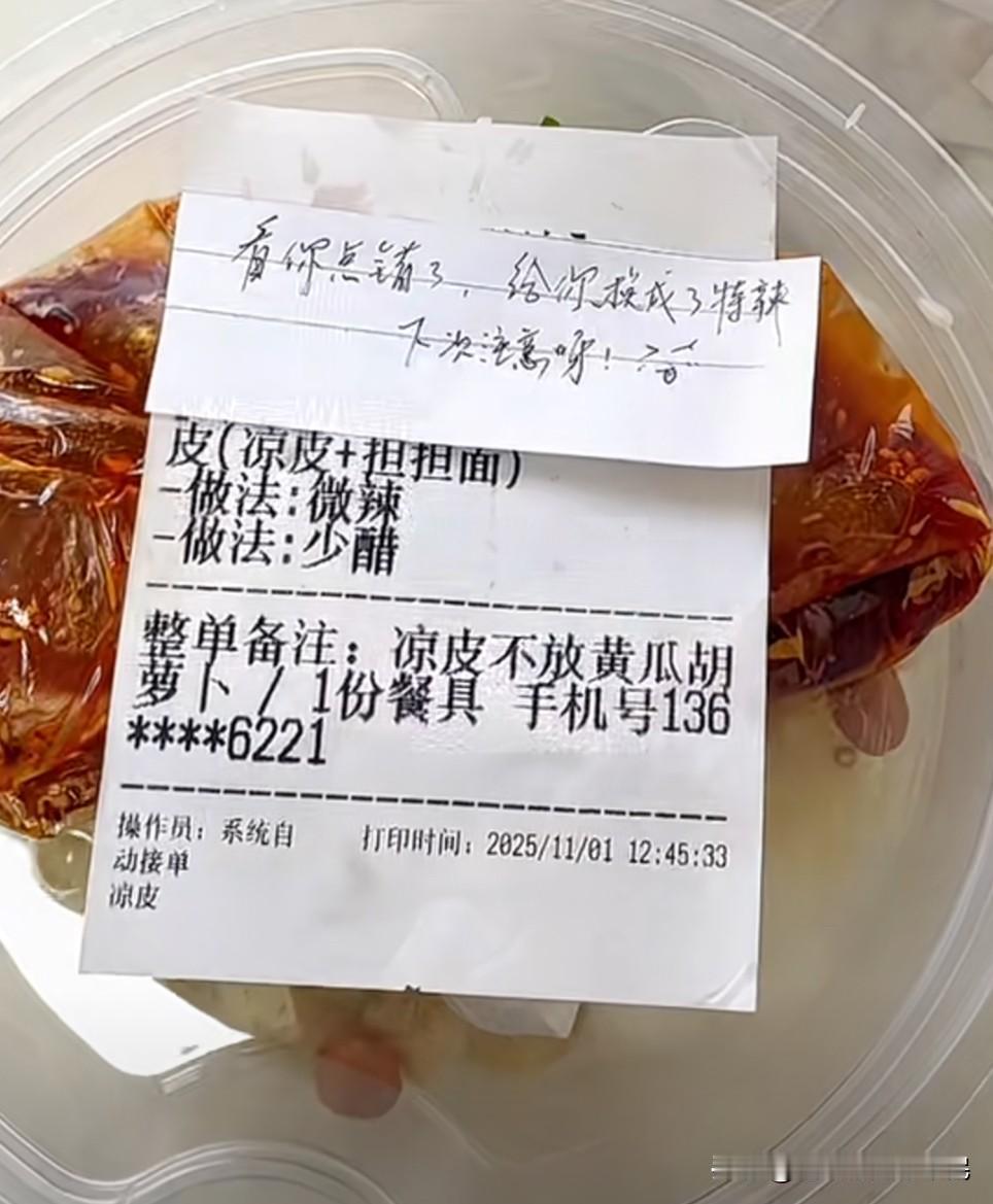 与外卖店老板熟悉后,连自主选择权都快消失了。天天吃一家店的外卖,而且每次都点特辣,今天肚子有点不舒服,就没点特辣,还备注了要微辣辣。 外卖送到后,看到老板给我写了便签:看你点错了,给你换成了特辣,下次休息呀! 哎,不是,这老板是不是还觉得自己很机智吖[流泪][流泪] 还有我长期吃的一家粉店,我经常备注要多一点香菜。有天给我妹点,她不吃香菜的,就备注不要香菜,那老板也是以为我备注错了,给我加了好多香菜!就又气又好笑。