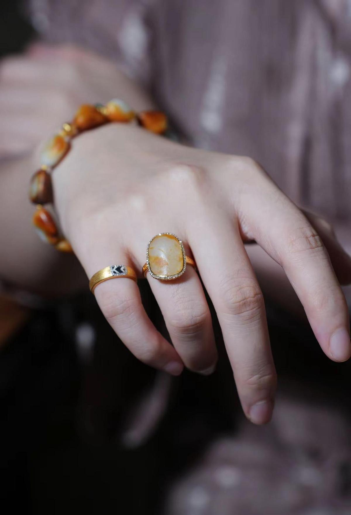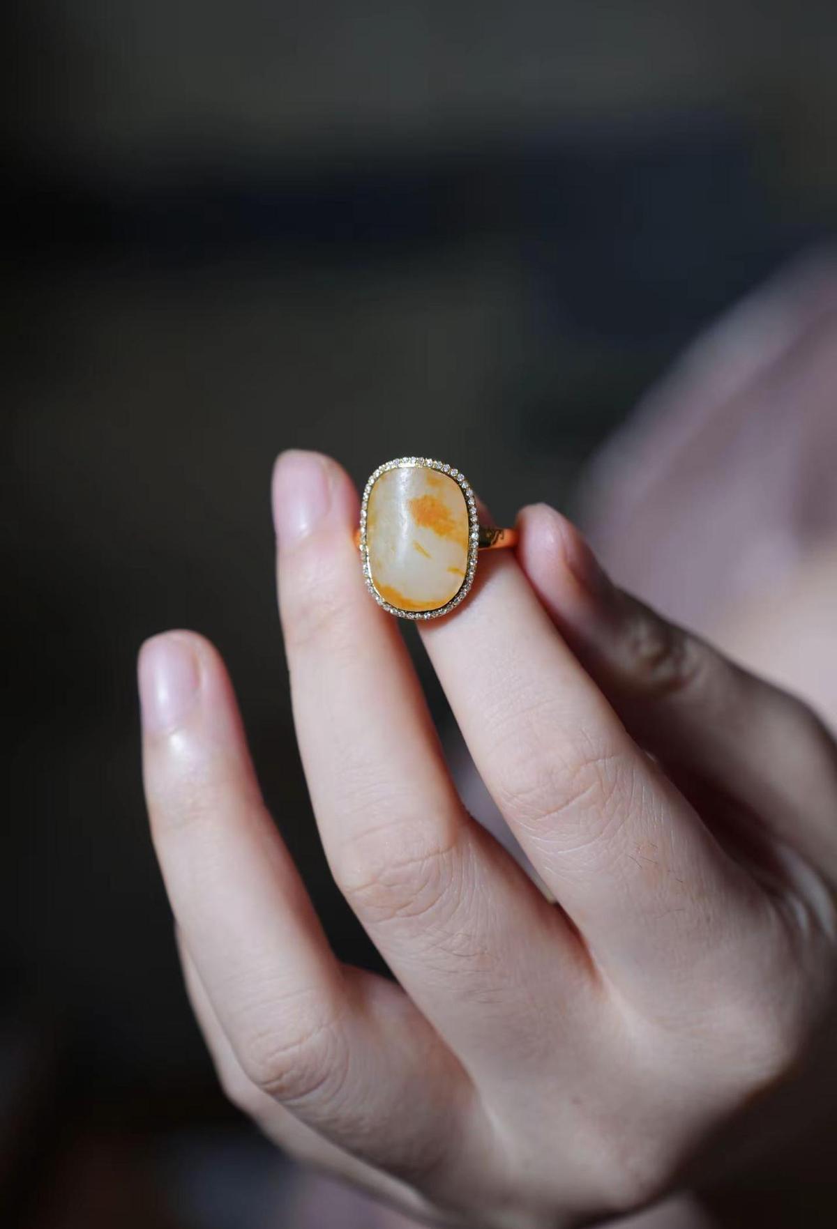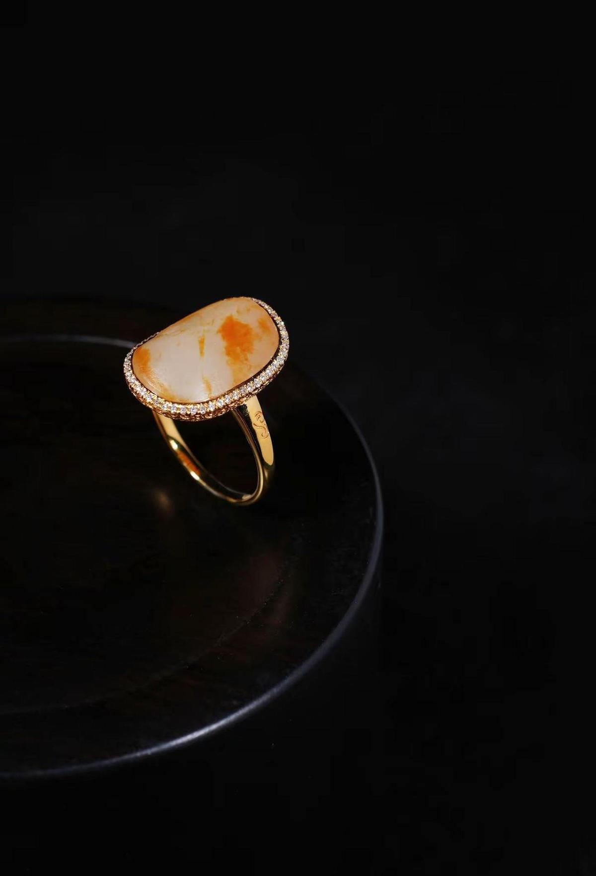 两枚玉戒指,没雕龙没刻凤,就靠一块老玉的皮色说话。 洒金黄,像秋天最后一片叶子,落在指间。 18K金轻轻一托,钻石不抢戏,只当个陪衬。 现在人不买大件了,就爱这点“小而耐看”。 老料子不说话,但皮色懂岁月。 马鞍戒,祖辈戴过的型,今儿配钻石,不土,叫复古。 一块籽料,万年成形,匠人不动刀,只让它自己讲完故事。 戴手上,不显山露水,可懂的人一眼知道——这玩意儿,值。 不追大牌,不靠证书,就靠那抹黄,稳稳地,压得住日子。