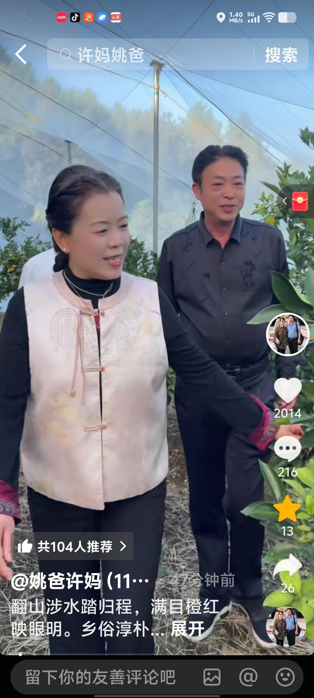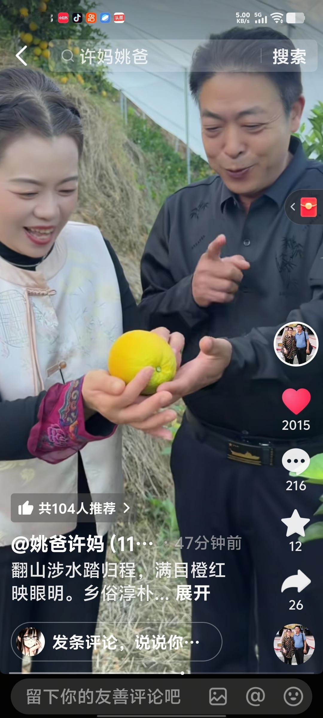 神仙场面!许妈姚爸返乡助力赣州脐橙,云雾仙境中尝鲜考察,粉丝评论区疯狂蹲购,勤劳夫妇再掀助农热潮~ 许妈,姚爸回到家乡助农。受到家乡的热烈欢迎。赣州脐橙的果园坐落在山腰。 老两口跟随着果园的人观察果子长的情况。山间云雾缭绕。青葱的果树上挂满沉甸甸的果子。 周围宛如仙境一般。许妈姚爸,行走在山间的小路上。品尝着这美味多汁的水果。 有很多村民在采摘,还有不少人在山脚下打包。这城市全国都闻名,非常的好吃。 看来徐妈瑶爸这次直播助农是要卖水果了。粉丝们都非常期待视频发出。 他来到评论区表示想买水果。上次是在延安,这次回到自己的家乡。许妈,姚爸真是太勤劳了。 上次的土特产你们买了吗?想不想买点橙子尝一尝?