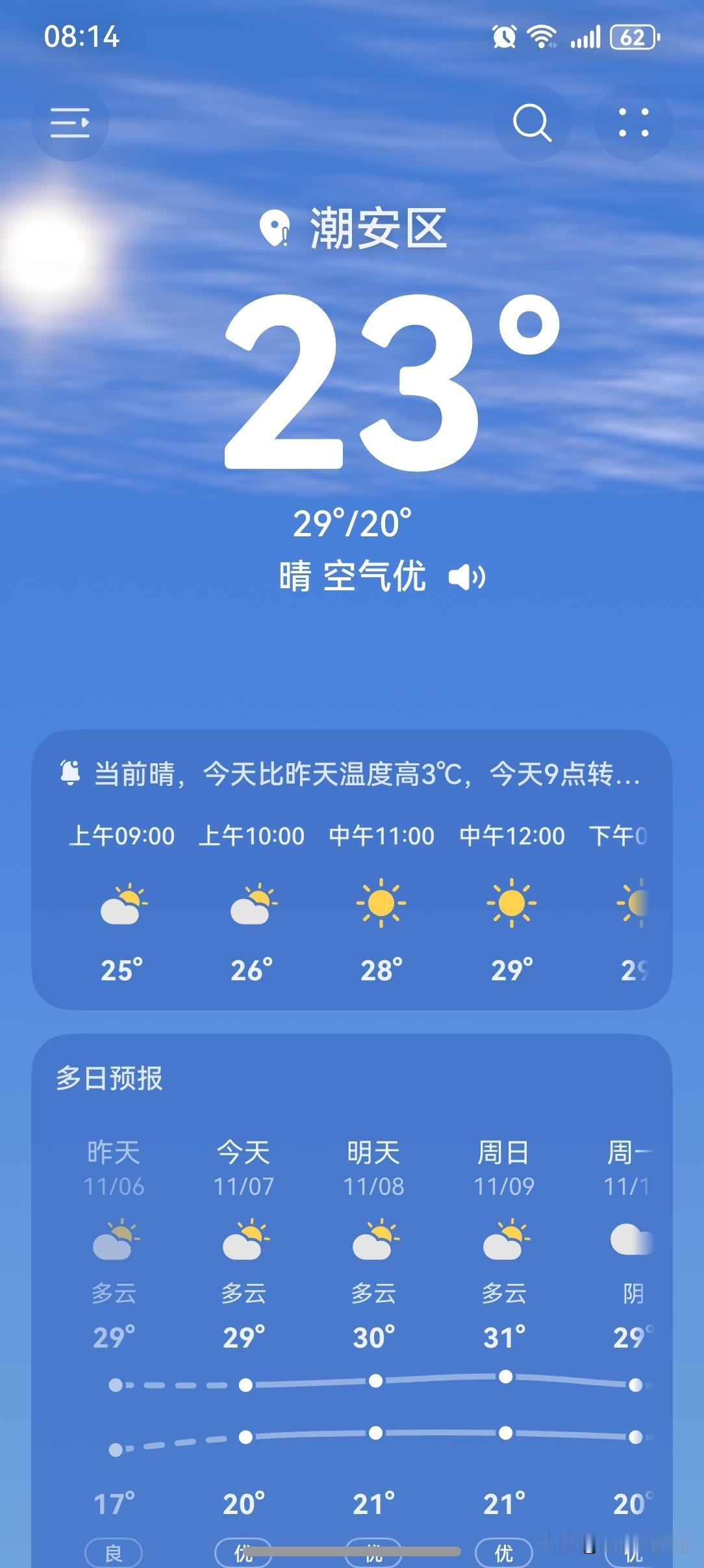 今日立冬! 北方已经开始过冬天了, 广东人还在过夏天! 未来几天, 广东气温回升,昼暖夜凉,温差较大, 早晚注意添衣! 7~8日, 粤西市县阴天有小雨, 其余市县多云, 局部有小雨, 气温逐渐回升。 9日,北方弱冷空气南下影响我省, 气温小幅下降, 我省大部多云为主。 今天(7日), 潮州喜提一个多云天气, 气温20~29℃, 此刻气温23℃, 体感温度25℃。 看看今天的天空, 阳光普照, 气温又要上升啦! 再次喜提29℃。 在立冬时节过夏天, 特别温暖, 甚至有点暖过头了! 今天的天气, 总体来讲还是是不错的, 值得五星好评! 如此天气! 元芳,你怎么看? [捂脸][笑哭][捂脸][笑哭][捂脸][笑哭][捂脸][笑哭][捂脸][笑哭]