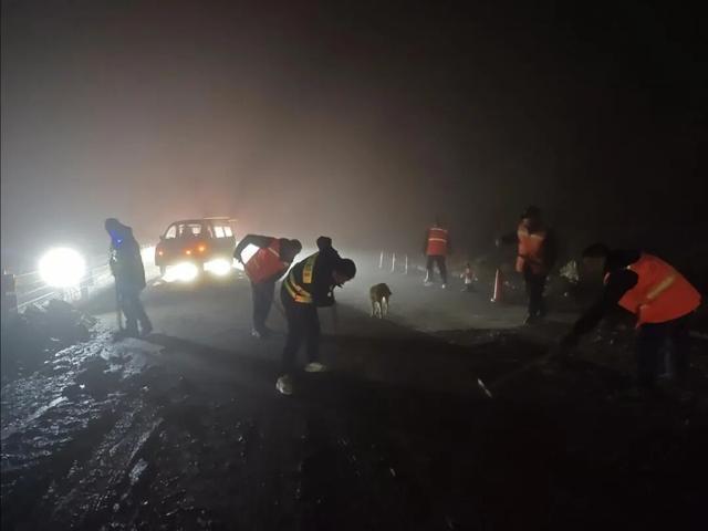 11月3日晚11时许,峨眉山市交通运输局接到群众险情反映后,立即启动应急处置预案,火速集结10人应急抢险队伍赶赴现场,连夜开展抢险作业。当晚,现场夜色与雨雾交织,能见度极低,给抢险工作带来极大挑战。抢险队员在现场架起多组应急照明灯,为作业区域搭建“光明防线”;在塌方路段前后设置爆闪警示灯、锥形桶等标识,划定安全作业区域,引导过往车辆绕行,防范二次事故发生。